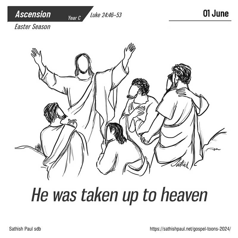 Puis Jésus les emmena au dehors, jusque vers Béthanie ; et, levant les mains, il les bénit. Or, tandis qu’il les bénissait, il se sépara d’eux et il était emporté au ciel. Ils se prosternèrent devant lui, puis ils retournèrent à Jérusalem, en grande joie. Et ils étaient sans cesse dans le Temple à bénir Dieu. (Lc 24, 46-53)