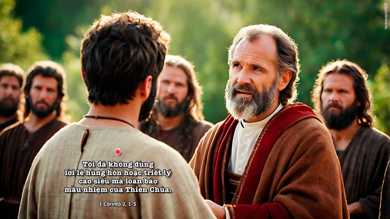 Thưa anh em, khi tôi đến với anh em, tôi đã không dùng lời lẽ hùng hồn hoặc triết lý cao siêu mà loan báo mầu nhiệm của Thiên Chúa. Vì hồi còn ở giữa anh em, tôi đã không muốn biết đến chuyện gì khác ngoài Đức Giê-su Ki-tô, mà là Đức Giê-su Ki-tô chịu đóng đinh vào thập giá. Vì thế, khi đến với anh em, tôi thấy mình yếu kém, sợ sệt và run rẩy. Tôi nói, tôi giảng mà chẳng có dùng lời lẽ khôn khéo hấp dẫn, nhưng chỉ dựa vào bằng chứng xác thực của Thần Khí và quyền năng Thiên Chúa. Có vậy, đức tin của anh em mới không dựa vào lẽ khôn ngoan người phàm, nhưng dựa vào quyền năng Thiên Chúa. Đó là lời Chúa.