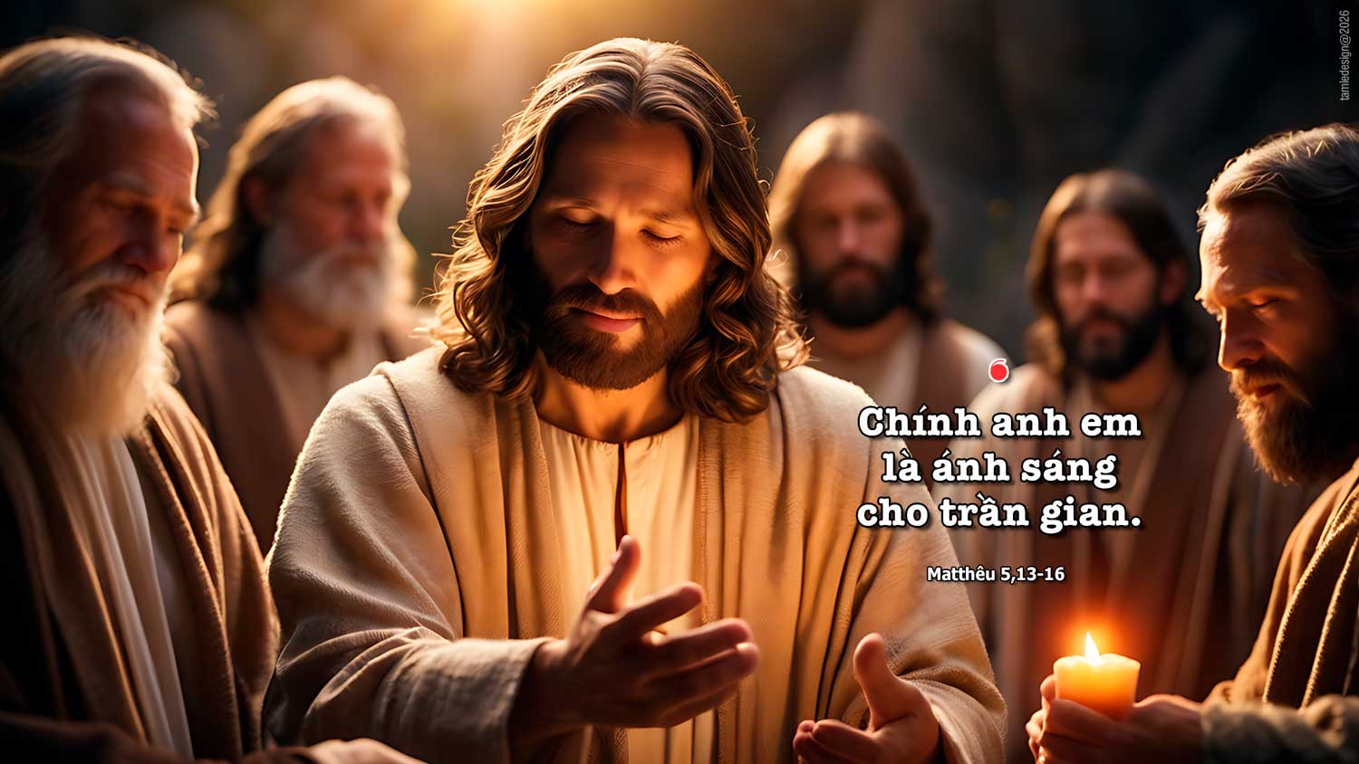 Khi ấy, Đức Giê-su nói với các môn đệ rằng: “Chính anh em là muối cho đời. Nhưng muối mà nhạt đi, thì lấy gì muối nó cho mặn lại? Nó đã thành vô dụng, thì chỉ còn việc quăng ra ngoài cho người ta chà đạp thôi. “Chính anh em là ánh sáng cho trần gian. Một thành xây trên núi không tài nào che giấu được. Cũng chẳng có ai thắp đèn rồi lại để dưới cái thùng, nhưng đặt trên đế, và đèn soi chiếu cho mọi người trong nhà. Cũng vậy, ánh sáng của anh em phải chiếu giãi trước mặt thiên hạ, để họ thấy những công việc tốt đẹp anh em làm, mà tôn vinh Cha của anh em, Đấng ngự trên trời. Đó là lời Chúa.