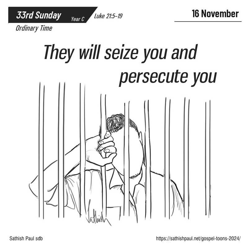 C’est moi qui vous donnerai un langage et une sagesse à laquelle tous vos adversaires ne pourront ni résister ni s’opposer. Vous serez livrés même par vos parents, vos frères, votre famille et vos amis, et ils feront mettre à mort certains d’entre vous. Vous serez détestés de tous, à cause de mon nom. Mais pas un cheveu de votre tête ne sera perdu. C’est par votre persévérance que vous garderez votre vie. (Lc 21, 5-19)