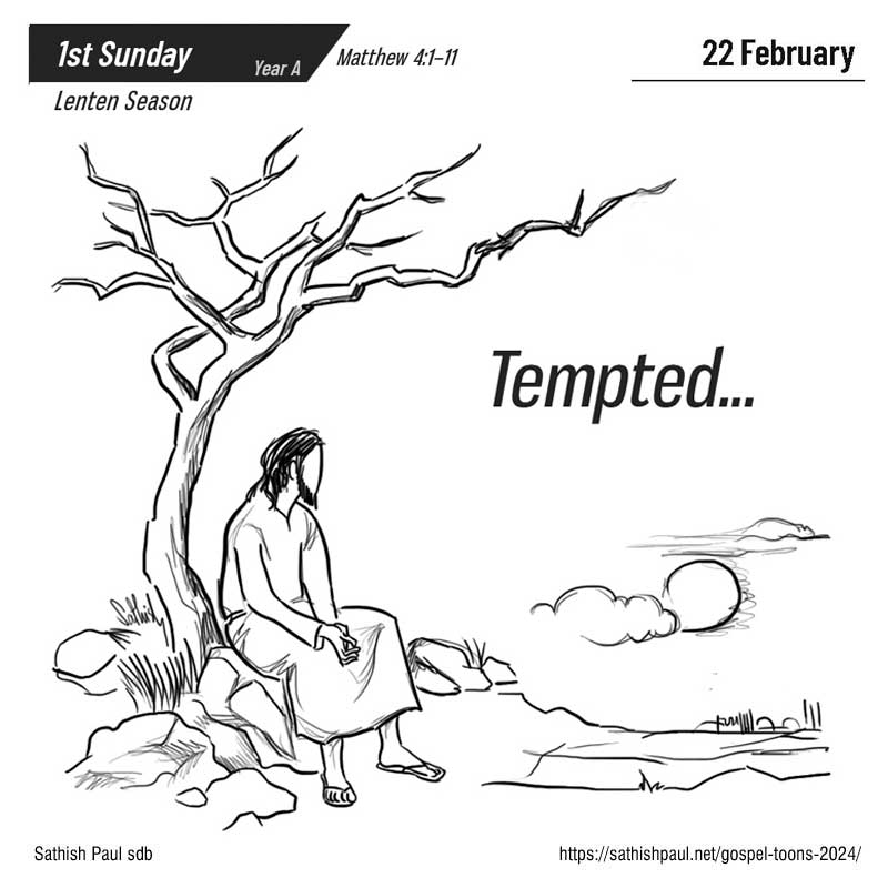 Sau khi chịu phép rửa, Đức Giê-su được Thần Khí dẫn vào hoang địa, để chịu quỷ cám dỗ. Người ăn chay ròng rã bốn mươi đêm ngày, và sau đó, Người thấy đói. Bấy giờ tên cám dỗ đến gần Người và nói: “Nếu ông là Con Thiên Chúa, thì truyền cho những hòn đá này hoá bánh đi!” Nhưng Người đáp: “Đã có lời chép rằng: Người ta sống không chỉ nhờ cơm bánh, nhưng còn nhờ mọi lời miệng Thiên Chúa phán ra.” Sau đó, quỷ đem Người đến thành thánh, và đặt Người trên nóc đền thờ, rồi nói với Người: “Nếu ông là Con Thiên Chúa, thì gieo mình xuống đi! Vì đã có lời chép rằng: Thiên Chúa sẽ truyền cho thiên sứ lo cho bạn, và thiên sứ sẽ tay đỡ tay nâng, cho bạn khỏi vấp chân vào đá.” Đức Giê-su đáp: “Nhưng cũng đã có lời chép rằng: Ngươi chớ thử thách Đức Chúa là Thiên Chúa của ngươi.” Quỷ lại đem Người lên một ngọn núi rất cao, và chỉ cho Người thấy tất cả các nước thế gian, và vinh hoa lợi lộc của các nước ấy, và bảo rằng: “Tôi sẽ cho ông tất cả những thứ đó, nếu ông sấp mình bái lạy tôi.” Đức Giê-su liền nói: “Xa-tan kia, xéo đi! Vì đã có lời chép rằng: Ngươi phải bái lạy Đức Chúa là Thiên Chúa của ngươi, và phải thờ phượng một mình Người mà thôi.” Thế rồi quỷ bỏ Người mà đi, và kìa các sứ thần tiến đến hầu hạ Người. Đó là lời Chúa.