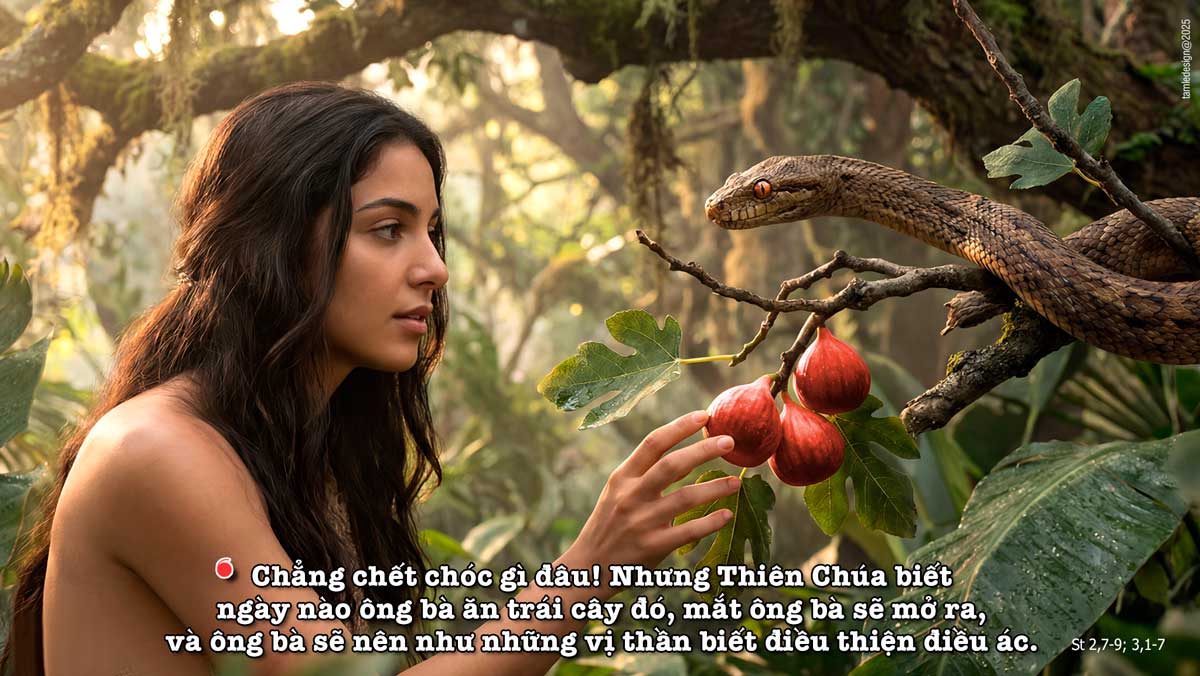 Đức Chúa là Thiên Chúa lấy bụi từ đất nặn ra con người, thổi sinh khí vào lỗ mũi, và con người trở nên một sinh vật. Rồi Đức Chúa là Thiên Chúa trồng một vườn cây ở Ê-đen, về phía đông, và đặt vào đó con người do chính mình nặn ra. Đức Chúa là Thiên Chúa khiến từ đất mọc lên đủ mọi thứ cây trông thì đẹp, ăn thì ngon, với cây trường sinh ở giữa vườn, và cây cho biết điều thiện điều ác. Rắn là loài xảo quyệt nhất trong mọi giống vật ngoài đồng, mà Đức Chúa là Thiên Chúa đã làm ra. Nó nói với người đàn bà: “Có thật Thiên Chúa bảo: ‘Các ngươi không được ăn hết mọi trái cây trong vườn không?’” Người đàn bà nói với con rắn: “Trái các cây trong vườn, thì chúng tôi được ăn. Còn trái trên cây ở giữa vườn, Thiên Chúa đã bảo: ‘Các ngươi không được ăn, không được động tới, kẻo phải chết’.”… Rắn nói với người đàn bà: “Chẳng chết chóc gì đâu! Nhưng Thiên Chúa biết ngày nào ông bà ăn trái cây đó, mắt ông bà sẽ mở ra, và ông bà sẽ nên như những vị thần biết điều thiện điều ác.” Người đàn bà thấy trái cây đó: ăn thì phải ngon, trông thì đẹp mắt, và đáng quý vì làm cho mình được tinh khôn. Bà liền hái trái cây mà ăn, rồi đưa cho cả chồng đang ở đó với mình; ông cũng ăn. Bấy giờ mắt hai người mở ra, và họ thấy mình trần truồng: họ mới kết lá vả làm khố che thân. Đó là lời Chúa.
