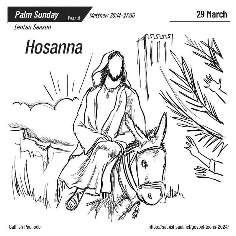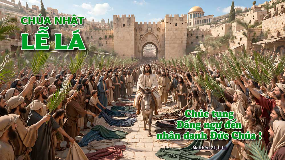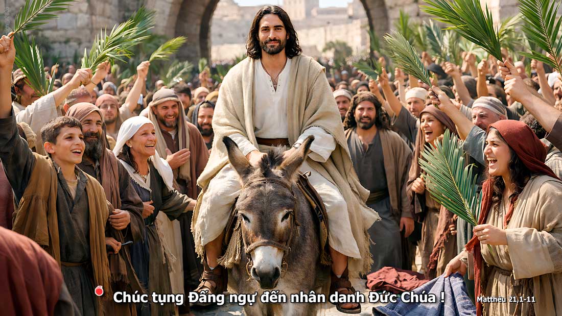 Mấy ngày trước lễ Vượt Qua, Đức Giê-su và các môn đệ đến gần thành Giê-ru-sa-lem và tới làng Bết-pha-ghê, phía núi Ô-liu, Đức Giê-su sai hai môn đệ và bảo: “Các anh đi vào làng trước mặt kia, và sẽ thấy ngay một con lừa mẹ đang cột sẵn đó, có con lừa con bên cạnh. Các anh tháo dây ra và dắt về cho Thầy. Nếu có ai nói gì với các anh, thì trả lời là Chúa cần đến chúng, Người sẽ gởi lại ngay”. Sự việc đó xảy ra như thế để ứng nghiệm lời ngôn sứ: Hãy bảo thiếu nữ Xi-on: Kìa Đức Vua của ngươi đang đến với ngươi hiền hậu ngồi trên lưng lừa, lưng lừa con, là con của một con vật chở đồ. Các môn đệ ra đi và làm theo lời Đức Giê-su đã truyền. Các ông dắt lừa mẹ và lừa con về, trải áo choàng của mình trên lưng chúng, và Đức Giê-su cỡi lên. Một đám người rất đông lấy áo mình trải xuống mặt đường, một số khác lại chặt nhành chặt lá mà rải lên lối đi. Đám đông, người đi trước, kẻ theo sau, reo hò vang dậy: Hoan hô Con vua Đa-vít! Chúc tụng Đấng ngự đến nhân danh Đức Chúa! Hoan hô trên các tầng trời. Khi Đức Giê-su vào Giê-ru-sa-lem, cả thành náo động, và thiên hạ hỏi nhau: “Ông này là ai vậy?” Đám đông trả lời: “Ngôn sứ Giê-su, người Na-da-rét, xứ Ga-li-lê đấy”. Đó là lời Chúa.