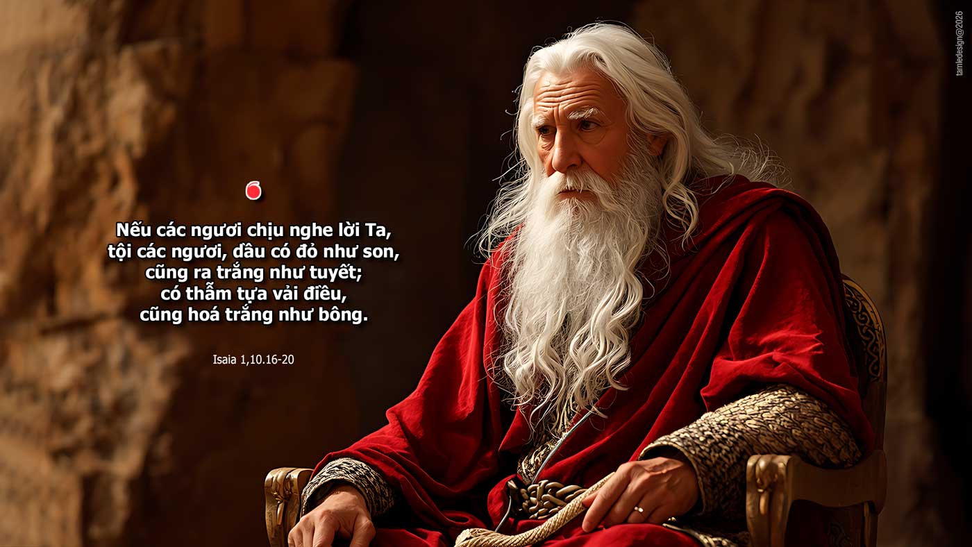 Hỡi những kẻ làm đầu Xơ-đôm, hãy nghe lời Đức Chúa phán. Hỡi dân Gô-mô-ra, hãy lắng tai nghe Thiên Chúa chúng ta dạy bảo… Hãy rửa cho sạch, tẩy cho hết, và vứt bỏ tội ác của các ngươi cho khỏi chướng mắt Ta. Đừng làm điều ác nữa. Hãy tập làm điều thiện, tìm kiếm lẽ công bình, sửa phạt người áp bức, xử công minh cho cô nhi, biện hộ cho quả phụ. Đức Chúa phán: “Hãy đến đây, ta cùng nhau tranh luận! Tội các ngươi, dầu có đỏ như son, cũng ra trắng như tuyết; có thẫm tựa vải điều, cũng hoá trắng như bông. Nếu các ngươi chịu nghe lời Ta, các ngươi sẽ được hưởng dùng hoa mầu trong xứ. Còn nếu các ngươi từ chối mà phản nghịch, các ngươi sẽ phải ăn gươm ăn giáo.” Miệng Đức Chúa đã phán như vậy. Đó là lời Chúa.