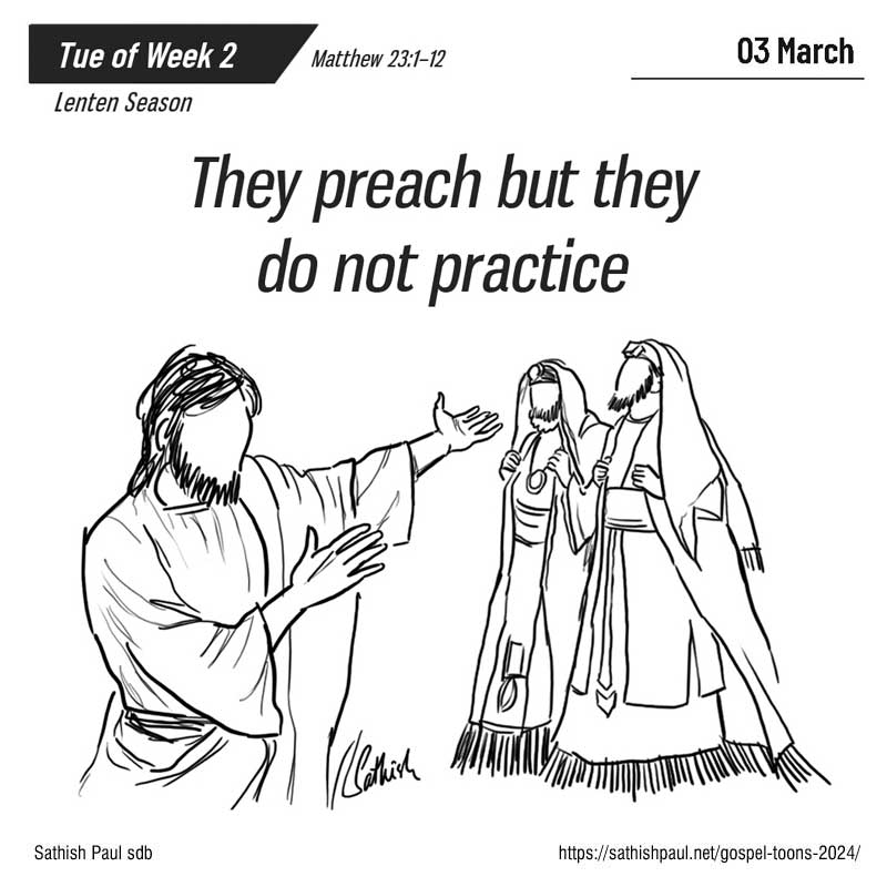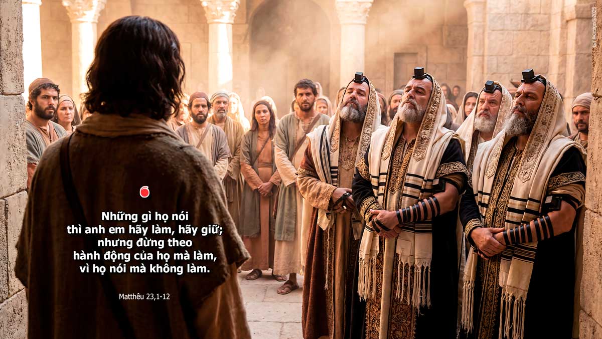 Bấy giờ, Đức Giê-su nói với đám đông và các môn đệ Người rằng: “Các kinh sư và các người Pha-ri-sêu ngồi trên toà ông Mô-sê mà giảng dạy. Vậy, những gì họ nói thì anh em hãy làm, hãy giữ; nhưng đừng theo hành động của họ mà làm, vì họ nói mà không làm. Họ bó những gánh nặng mà chất lên vai người ta, nhưng chính họ thì lại không buồn động ngón tay vào. Họ làm mọi việc cốt để cho thiên hạ thấy. Quả vậy, họ đeo những hộp kinh thật lớn, mang những tua áo thật dài. Họ ưa ngồi cỗ nhất trong đám tiệc, chiếm hàng ghế đầu trong hội đường, ưa được người ta chào hỏi ở những nơi công cộng và được thiên hạ gọi là “ráp-bi”. “Phần anh em, thì đừng để ai gọi mình là “ráp-bi”, vì anh em chỉ có một Thầy; còn tất cả anh em đều là anh em với nhau. Anh em cũng đừng gọi ai dưới đất này là cha của anh em, vì anh em chỉ có một Cha là Cha trên trời. Anh em cũng đừng để ai gọi mình là người lãnh đạo, vì anh em chỉ có một vị lãnh đạo, là Đức Ki-tô. Trong anh em, người làm lớn hơn cả, phải làm người phục vụ anh em. Ai tôn mình lên, sẽ bị hạ xuống; còn ai hạ mình xuống, sẽ được tôn lên. Đó là lời Chúa.