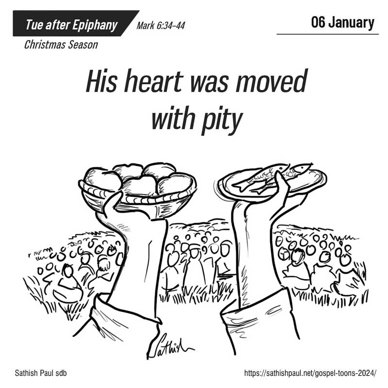 Khi Đức Giê-su thấy một đoàn người đông đảo thì chạnh lòng thương, vì họ như bầy chiên không người chăn dắt. Và Người bắt đầu dạy dỗ họ nhiều điều. Vì bấy giờ đã khá muộn, các môn đệ đến gần Người và thưa: “Ở đây hoang vắng và bây giờ đã khá muộn. Xin Thầy cho dân chúng về, để họ vào thôn xóm và làng mạc chung quanh mà mua gì ăn.” Người đáp: “Thì chính anh em hãy cho họ ăn đi!” Các ông nói với Người:”Chúng con phải đi mua tới hai trăm quan tiền bánh mà cho họ ăn sao?” Người bảo các ông: “Anh em có mấy chiếc bánh? Đi coi xem!” Khi biết rồi, các ông thưa: “Có năm chiếc bánh và hai con cá.” Người ra lệnh cho các ông bảo mọi người ngả lưng thành từng nhóm trên cỏ xanh. Họ ngả lưng xuống thành từng đám, chỗ thì một trăm, chỗ thì năm mươi. Người cầm lấy năm chiếc bánh và hai con cá, ngước mắt lên trời, dâng lời chúc tụng, rồi bẻ bánh ra, trao cho môn đệ để các ông dọn ra cho dân chúng. Người cũng chia hai con cá cho mọi người. Ai nấy đều ăn và được no nê. Người ta thu lại những mẩu bánh được mười hai thúng đầy, cùng với cá còn dư. Số người ăn bánh là năm ngàn người đàn ông. Đó là lời Chúa.