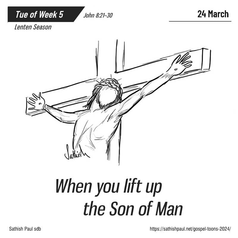 « Quand vous aurez élevé le Fils de l’homme, alors vous comprendrez que moi, JE SUIS, et que je ne fais rien de moi-même ; ce que je dis là, je le dis comme le Père me l’a enseigné. Celui qui m’a envoyé est avec moi ; il ne m’a pas laissé seul, parce que je fais toujours ce qui lui est agréable. » (Jn 8, 21-30)