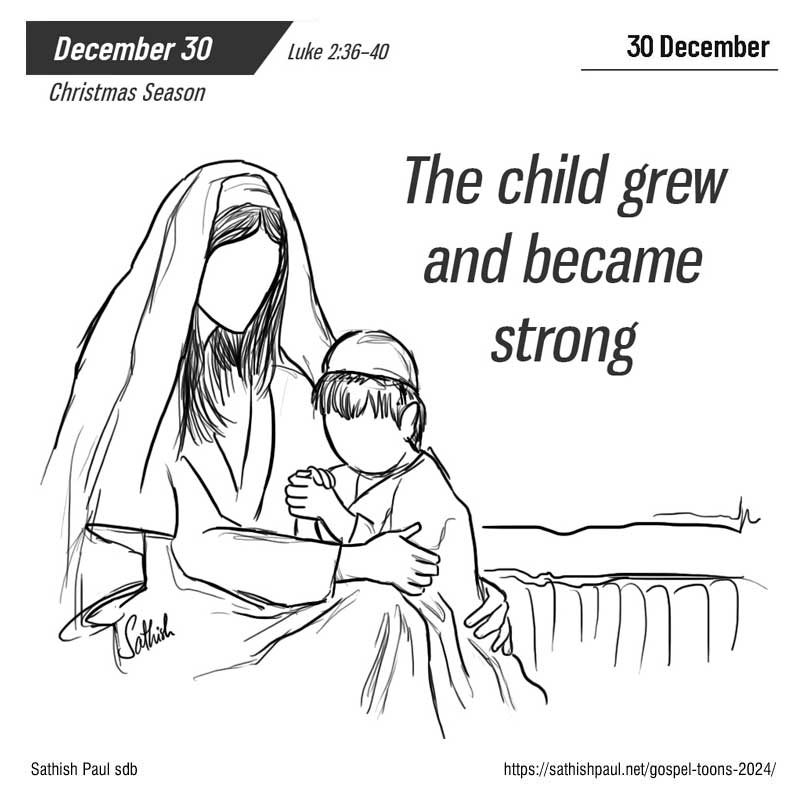 Lorsqu’ils eurent achevé tout ce que prescrivait la loi du Seigneur, ils retournèrent en Galilée, dans leur ville de Nazareth. L’enfant, lui, grandissait et se fortifiait, rempli de sagesse, et la grâce de Dieu était sur lui. (Lc 2, 36-40)