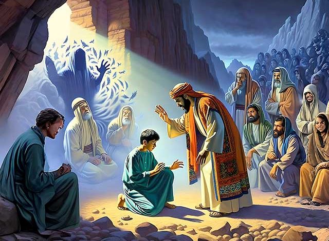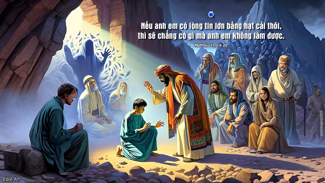 Khi ấy, Đức Giê-su và các môn đệ đến với đám đông, thì có một người tới quỳ xuống trước mặt Đức Giê-su và nói: “Thưa Ngài, xin thương xót con trai tôi, vì cháu bị kinh phong và bệnh tình nặng lắm: nhiều lần ngã vào lửa, và cũng nhiều lần ngã xuống nước. Tôi đã đem cháu đến cho các môn đệ Ngài chữa, nhưng các ông không chữa được.” Đức Giê-su đáp: “Ôi thế hệ cứng lòng không chịu tin và gian tà! Tôi còn phải ở với các người cho đến bao giờ, còn phải chịu đựng các người cho đến bao giờ nữa? Đem cháu lại đây cho tôi.” Đức Giê-su quát mắng tên quỷ, quỷ liền xuất, và đứa bé được khỏi ngay từ giờ đó. Bấy giờ các môn đệ đến gần hỏi riêng Đức Giê-su rằng: “Tại sao chúng con đây lại không trừ nổi tên quỷ ấy? ” Người nói với các ông: “Tại anh em kém tin! Thầy bảo thật anh em: nếu anh em có lòng tin lớn bằng hạt cải thôi, thì dù anh em có bảo núi này: “rời khỏi đây, qua bên kia! ” nó cũng sẽ qua, và sẽ chẳng có gì mà anh em không làm được. Đó là lời Chúa.