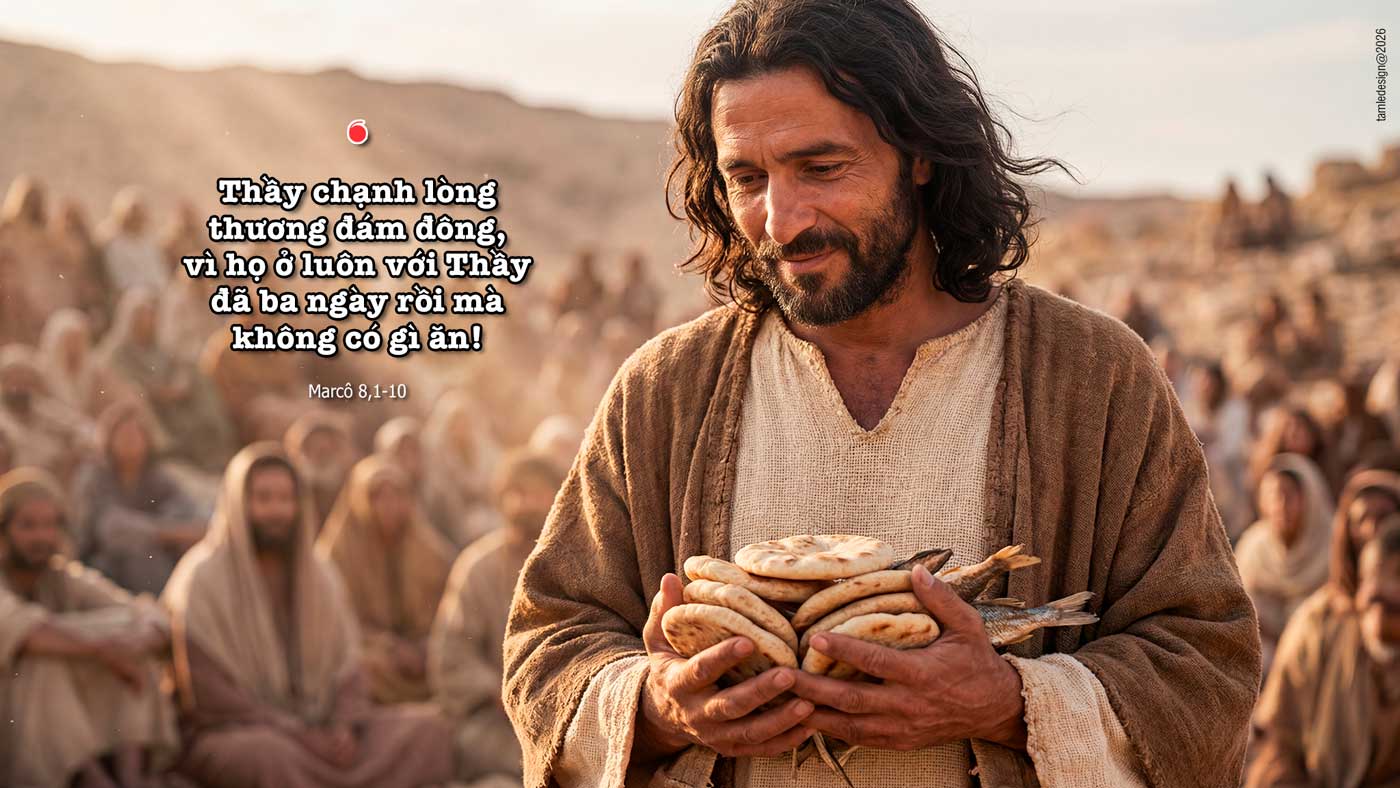 Trong những ngày ấy, lại có rất đông dân chúng, và họ không có gì ăn, nên Đức Giê-su gọi các môn đệ lại mà nói: “Thầy chạnh lòng thương đám đông, vì họ ở luôn với Thầy đã ba ngày rồi mà không có gì ăn! Nếu Thầy giải tán, để họ nhịn đói mà về nhà, thì họ sẽ bị xỉu dọc đường. Trong số đó, lại có những người ở xa đến.” Các môn đệ thưa Người: “Ở đây, trong nơi hoang vắng này, lấy đâu ra bánh cho họ ăn no?” Người hỏi các ông: “Anh em có mấy chiếc bánh?” Các ông đáp: “Thưa có bảy chiếc.” Người truyền cho đám đông ngả lưng xuống đất. Rồi Người cầm lấy bảy chiếc bánh, dâng lời tạ ơn, và bẻ ra, trao cho các môn đệ để các ông dọn ra. Và các ông đã dọn ra cho đám đông. Các ông cũng có mấy con cá nhỏ. Người đọc lời chúc tụng, rồi bảo các ông dọn cả cá ra. Đám đông đã ăn và được no nê. Người ta nhặt lấy những mẩu bánh còn thừa: bảy giỏ! Mà đám đông có khoảng bốn ngàn người. Người giải tán họ. Lập tức, Đức Giê-su xuống thuyền với các môn đệ và đến miền Đan-ma-nu-tha. Đó là lời Chúa.