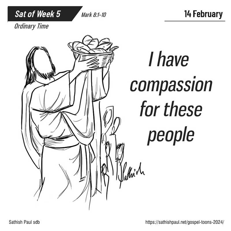 En ces jours-là, comme il y avait une grande foule, et que les gens n’avaient rien à manger, Jésus appelle à lui ses disciples et leur dit : « J’ai de la compassion pour cette foule, car depuis trois jours déjà ils restent auprès de moi, et n’ont rien à manger. Si je les renvoie chez eux à jeun, ils vont défaillir en chemin, et certains d’entre eux sont venus de loin. » (Mc 8, 1-10)