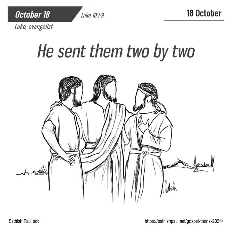 Một hôm, Chúa chỉ định bảy mươi hai môn đệ khác, và sai các ông cứ từng hai người một đi trước, vào tất cả các thành, các nơi mà chính Người sẽ đến. Người bảo các ông: “Lúa chín đầy đồng mà thợ gặt lại ít. Vậy anh em hãy xin chủ mùa gặt sai thợ ra gặt lúa về. Anh em hãy ra đi. Này Thầy sai anh em đi như chiên con đi vào giữa bầy sói. Đừng mang theo túi tiền, bao bị, giày dép. Cũng đừng chào hỏi ai dọc đường. Vào bất cứ nhà nào, trước tiên hãy nói: “Bình an cho nhà này!” Nếu ở đó, có ai đáng hưởng bình an, thì bình an của anh em sẽ đến đậu trên người ấy; bằng không, thì bình an đó sẽ quay về với anh em. Hãy ở lại nhà ấy, và người ta cho ăn uống thức gì, thì anh em dùng thức đó, vì làm thợ thì đáng được trả công. Đừng đi hết nhà nọ đến nhà kia. Vào bất cứ thành nào mà được người ta tiếp đón, thì cứ ăn những gì người ta dọn cho anh em. Hãy chữa những người đau yếu trong thành, và nói với họ: “Triều Đại Thiên Chúa đã đến gần các ông.” Đó là lời Chúa.