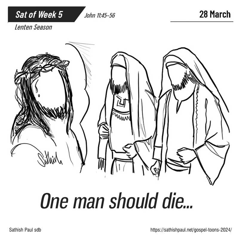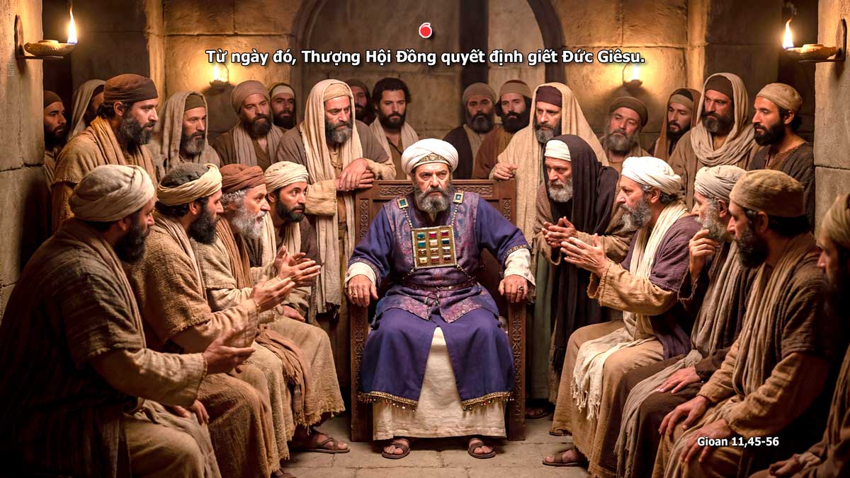 Khi ấy, trong số những người Do-thái đến thăm cô Ma-ri-a và được chứng kiến việc Đức Giê-su làm, có nhiều kẻ đã tin vào Người. Nhưng lại có những người đi gặp nhóm Pha-ri-sêu và kể cho họ những gì Đức Giê-su đã làm. Vậy các thượng tế và các người Pha-ri-sêu triệu tập Thượng Hội Đồng và nói: “Chúng ta phải làm gì đây? Người này làm nhiều dấu lạ. Nếu chúng ta cứ để ông ấy tiếp tục, mọi người sẽ tin vào ông ấy, rồi người Rô-ma sẽ đến phá huỷ cả nơi thánh của ta lẫn dân tộc ta.” Một người trong Thượng Hội Đồng tên là Cai-pha, làm thượng tế năm ấy, nói rằng: “Các ông không hiểu gì cả, các ông cũng chẳng nghĩ đến điều lợi cho các ông là: thà một người chết thay cho dân còn hơn là toàn dân bị tiêu diệt.” Điều đó, ông không tự mình nói ra, nhưng vì ông là thượng tế năm ấy, nên đã nói tiên tri là Đức Giê-su sắp phải chết thay cho dân, và không chỉ thay cho dân mà thôi, nhưng còn để quy tụ con cái Thiên Chúa đang tản mác khắp nơi về một mối. Từ ngày đó, họ quyết định giết Đức Giê-su. Vậy Đức Giê-su không đi lại công khai giữa người Do-thái nữa; nhưng từ nơi ấy, Người đến một vùng gần hoang địa, tới một thành gọi là Ép-ra-im. Người ở lại đó với các môn đệ. Lễ Vượt Qua của người Do-thái đã gần đến. Từ miền quê, nhiều người lên Giê-ru-sa-lem trước lễ Vượt Qua để thanh tẩy mình. Họ tìm Đức Giê-su và đứng trong Đền Thờ bàn tán với nhau: “Có thể ông ấy sẽ không lên dự lễ, các ông có nghĩ thế không?” Đó là lời Chúa.