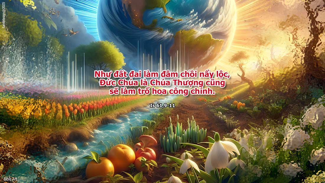 Dòng dõi các ngươi sẽ nức tiếng giữa chư dân, và giống nòi các ngươi sẽ lừng danh giữa muôn nước. Tất cả những ai thấy các ngươi sẽ biết rằng các ngươi là một dòng dõi được Đức Chúa ban phúc lành. Tôi mừng rỡ muôn phần nhờ Đức Chúa, nhờ Thiên Chúa tôi thờ, tôi hớn hở biết bao! Vì người mặc cho tôi hồng ân cứu độ, choàng cho tôi đức chính trực công minh, như chú rể chỉnh tề khăn áo, tựa cô dâu lộng lẫy điểm trang. Như đất đai làm đâm chồi nẩy lộc, như vườn tược cho nở hạt sinh mầm, Đức Chúa là Chúa Thượng cũng sẽ làm trổ hoa công chính, làm trổi vang lời ca ngợi trước mặt muôn dân. Đó là lời Chúa.