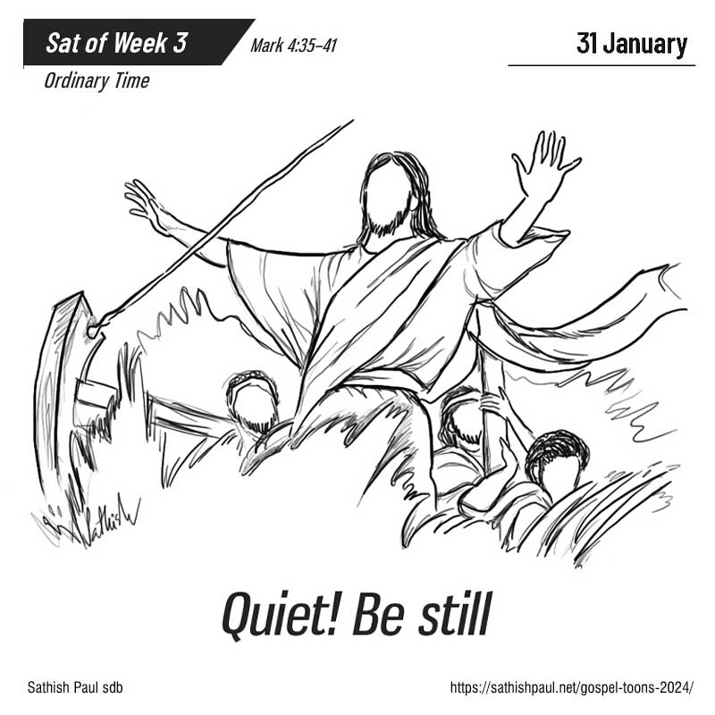 Les vagues se jetaient sur la barque, si bien que déjà elle se remplissait. Lui dormait sur le coussin à l’arrière. Les disciples le réveillent et lui disent : « Maître, nous sommes perdus ; cela ne te fait rien ? » Réveillé, il menaça le vent et dit à la mer : « Silence, tais-toi ! » Le vent tomba, et il se fit un grand calme. Jésus leur dit : « Pourquoi êtes-vous si craintifs ? N’avez-vous pas encore la foi ? » (Mc 4, 35-41)