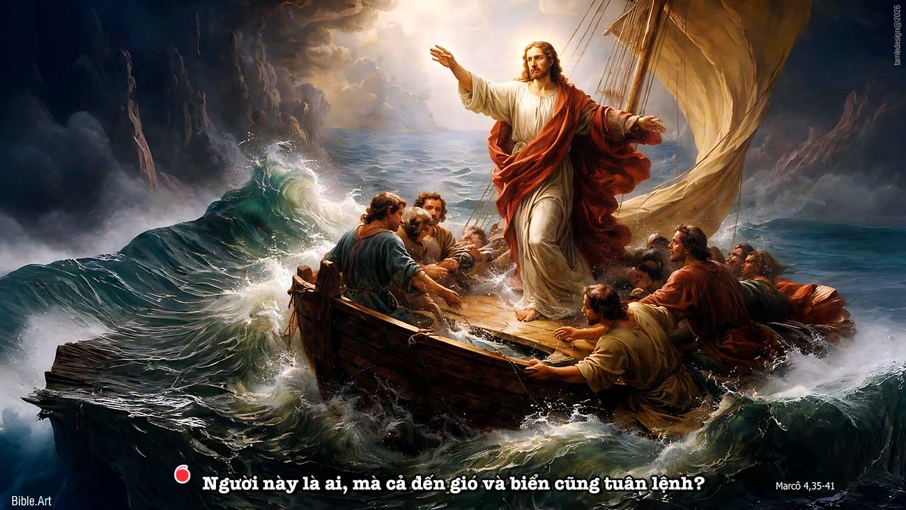 Hôm ấy, khi chiều đến, Đức Giê-su nói với các môn đệ: “Chúng ta sang bờ bên kia đi!” Bỏ đám đông ở lại, các ông chở Người đi, vì Người đang ở sẵn trên thuyền; có những thuyền khác cùng theo Người. Một trận cuồng phong nổi lên, sóng ập vào thuyền, đến nỗi thuyền đầy nước. Trong khi đó, Đức Giê-su đang ở đàng lái, dựa đầu vào chiếc gối mà ngủ. Các môn đệ đánh thức Người dậy và nói: “Thầy ơi, chúng ta chết mất, Thầy chẳng lo gì sao?” Người thức dậy, ngăm đe gió, và truyền cho biển: “Im đi! Câm đi!” Gió liền tắt, và biển lặng như tờ. Rồi Người bảo các ông: “Sao nhát thế? Anh em vẫn chưa có lòng tin sao?” Các ông sợ hãi kinh hoàng và nói với nhau: “Vậy người này là ai, mà cả đến gió và biển cũng tuân lệnh?” Đó là lời Chúa.