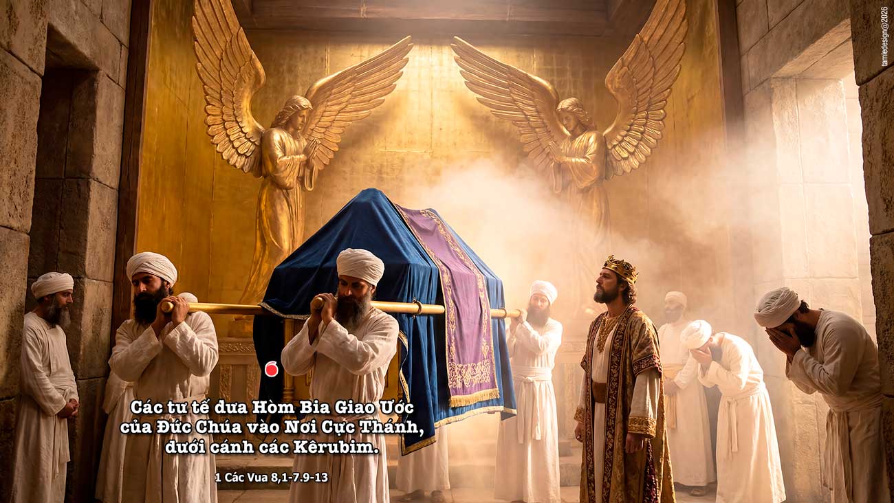 Bấy giờ vua Sa-lô-môn triệu tập bên mình, tại Giê-ru-sa-lem, các kỳ mục Ít-ra-en, gồm tất cả các người đứng đầu các chi tộc cùng các trưởng tộc con cái Ít-ra-en, để đưa Hòm Bia Giao Ước của Đức Chúa lên, từ Thành vua Đa-vít tức là Xi-on. Mọi người Ít-ra-en tập họp lại bên vua Sa-lô-môn trong tháng Ê-ta-nim tức là tháng thứ bảy để mừng lễ. Tất cả các kỳ mục Ít-ra-en đều tới; các tư tế thì khiêng Hòm Bia, và đưa Hòm Bia của Đức Chúa cũng như Lều Hội Ngộ và tất cả các vật dụng thánh trong Lều lên. Các tư tế và các thầy Lê-vi đưa những thứ ấy lên. Vua Sa-lô-môn và toàn thể cộng đồng Ít-ra-en tụ họp lại bên cạnh vua trước Hòm Bia, sát tế chiên bò nhiều vô kể, không sao đếm nổi. Các tư tế đưa Hòm Bia Giao Ước của Đức Chúa vào nơi đã dành sẵn trong cung Đơ-via của Đền Thờ, tức là Nơi Cực Thánh, dưới cánh các Kê-ru-bim. Quả vậy, các Kê-ru-bim xoè cánh ra bên trên Hòm Bia, che phía trên Hòm Bia và các đòn khiêng… Trong Hòm Bia không có gì ngoài hai Bia đá ông Mô-sê đã đặt vào đó, trên núi Khô-rếp, khi Đức Chúa lập Giao Ước với con cái Ít-ra-en vào thời họ ra khỏi đất Ai-cập. Khi các tư tế ra khỏi Cung Thánh, thì có đám mây toả đầy Đền Thờ Đức Chúa. Các tư tế không thể tiếp tục thi hành nhiệm vụ được vì đám mây: quả thật, vinh quang Đức Chúa đã tràn ngập Đền Thờ Đức Chúa. Bấy giờ vua Sa-lô-môn nói : “Đức Chúa đã phán : Người sẽ ngự trong đám mây dày đặc. Vâng, Con đã xây cho Ngài một ngôi nhà cao sang, một nơi để Ngài ngự muôn đời.” Đó là lời Chúa.
