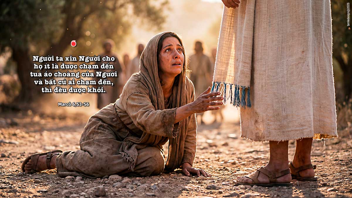 Khi qua biển rồi, Đức Giê-su và các môn đệ ghé vào đất liền tại Ghen-nê-xa-rét và lên bờ. Thầy trò vừa ra khỏi thuyền, thì lập tức người ta nhận ra Đức Giê-su. Họ rảo khắp vùng ấy và nghe tin Người ở đâu, thì bắt đầu cáng bệnh nhân đến đó. Người đi tới đâu, vào làng mạc, thành thị hay thôn xóm nào, người ta cũng đặt kẻ ốm đau ở ngoài đường ngoài chợ, và xin Người cho họ ít là được chạm đến tua áo choàng của Người; và bất cứ ai chạm đến, thì đều được khỏi. Đó là lời Chúa.