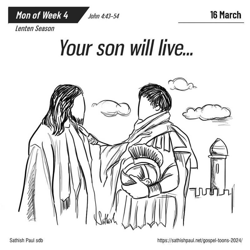 Jésus lui dit : « Si vous ne voyez pas de signes et de prodiges, vous ne croirez donc pas ! » Le fonctionnaire royal lui dit : « Seigneur, descends, avant que mon enfant ne meure ! » Jésus lui répond : « Va, ton fils est vivant. » L’homme crut à la parole que Jésus lui avait dite et il partit. Pendant qu’il descendait, ses serviteurs arrivèrent à sa rencontre et lui dirent que son enfant était vivant. (Jn 4, 43-54)