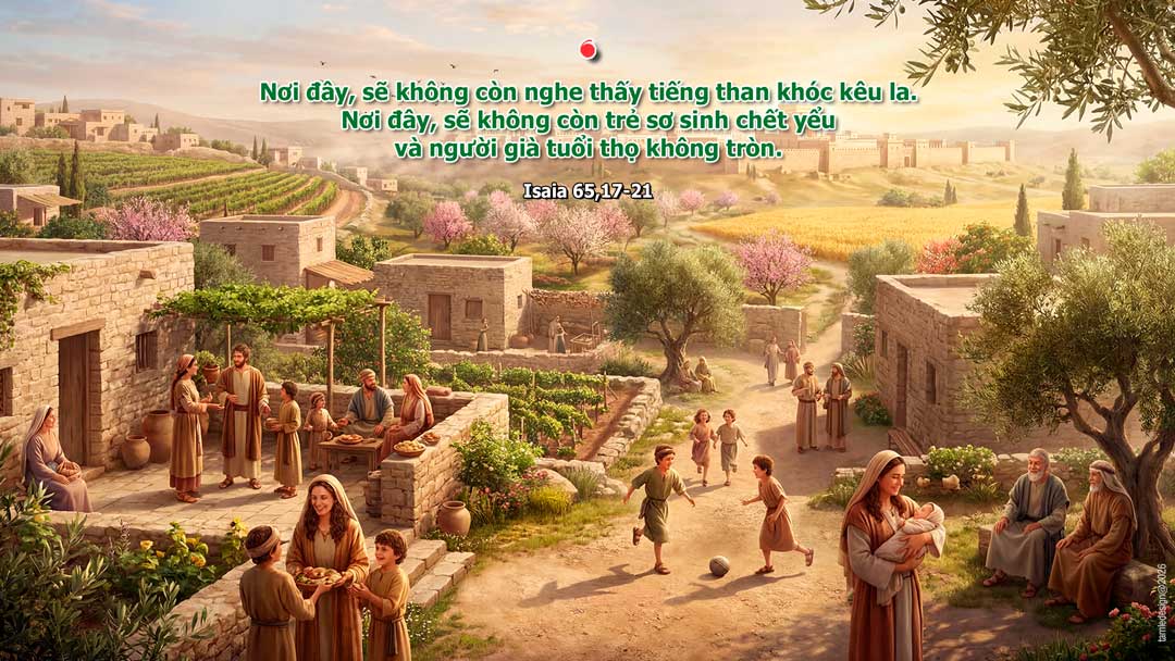 Đức Chúa phán như sau: “Này đây Ta sáng tạo trời mới đất mới, không còn ai nhớ đến thuở ban đầu và nhắc lại trong tâm trí nữa. Nhưng thiên hạ sẽ vui mừng và luôn mãi hỷ hoan vì những gì chính Ta sáng tạo. Phải, này đây Ta sẽ tạo Giê-ru-sa-lem nên nguồn hoan hỷ và dân ở đó thành nỗi vui mừng. Vì Giê-ru-sa-lem, Ta sẽ hoan hỷ, vì dân Ta, Ta sẽ nhảy mừng. Nơi đây, sẽ không còn nghe thấy tiếng than khóc kêu la. Nơi đây, sẽ không còn trẻ sơ sinh chết yểu và người già tuổi thọ không tròn; vì trăm tuổi mà chết là chết trẻ, và chưa tròn trăm tuổi mà chết là bị nguyền rủa. Người ta sẽ xây nhà và được ở, sẽ trồng nho và được ăn trái.” Đó là lời Chúa.