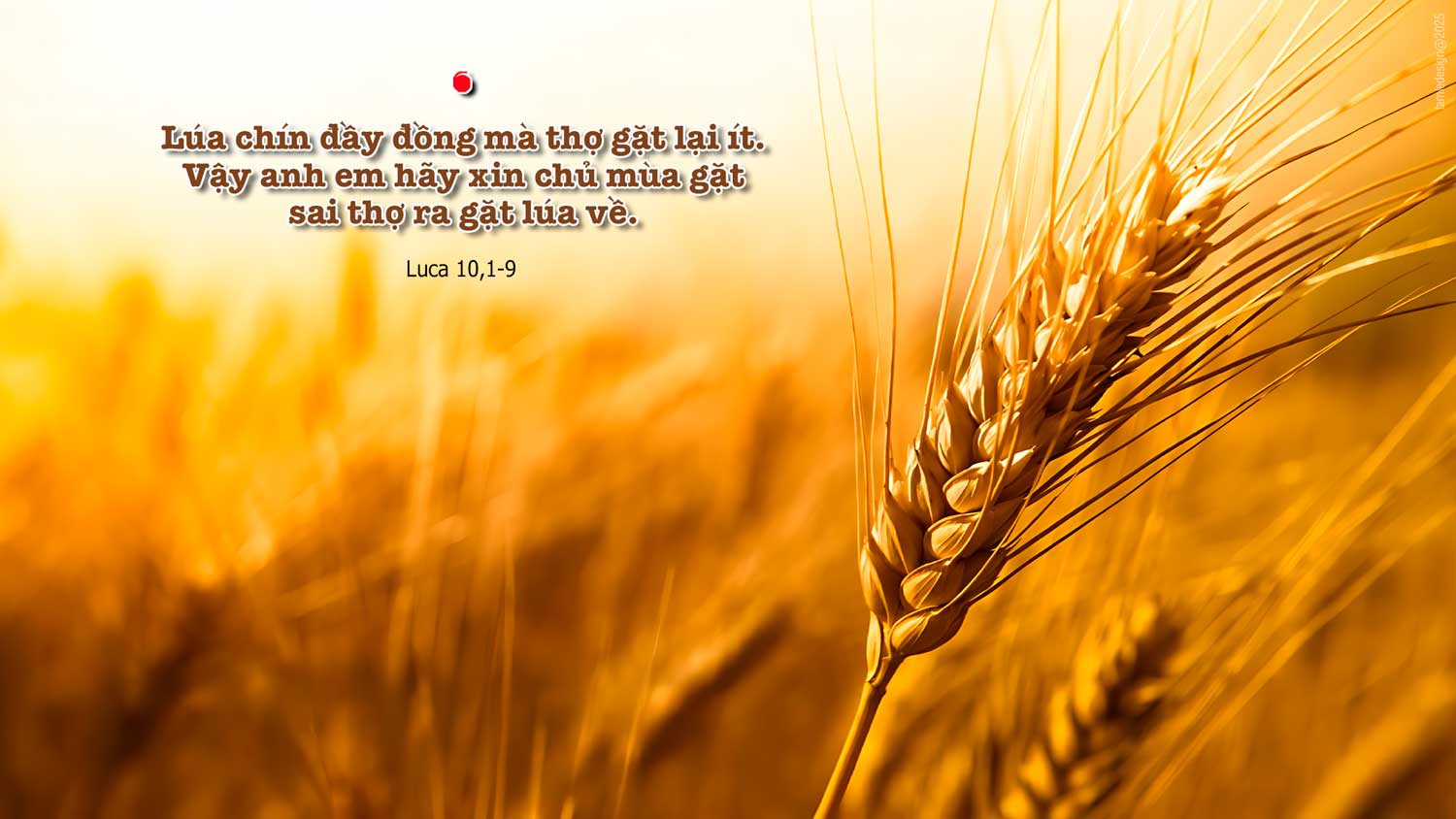 Một hôm, Chúa Giê-su chỉ định bảy mươi hai người khác, và sai các ông cứ từng hai người một đi trước, vào tất cả các thành, các nơi mà chính Người sẽ đến. Người bảo các ông: “Lúa chín đầy đồng mà thợ gặt lại ít. Vậy anh em hãy xin chủ mùa gặt sai thợ ra gặt lúa về. Anh em hãy ra đi. Này Thầy sai anh em đi như chiên con đi vào giữa bầy sói. Đừng mang theo túi tiền, bao bị, giày dép. Cũng đừng chào hỏi ai dọc đường. Vào bất cứ nhà nào, trước tiên hãy nói: “Bình an cho nhà này!” Nếu ở đó, có ai đáng hưởng bình an, thì bình an của anh em sẽ đến đậu trên người ấy; bằng không, thì bình an đó sẽ quay về với anh em. Hãy ở lại nhà ấy, và người ta cho ăn uống thức gì, thì anh em dùng thức đó, vì làm thợ thì đáng được trả công. Đừng đi hết nhà nọ đến nhà kia. Vào bất cứ thành nào mà được người ta tiếp đón, thì cứ ăn những gì người ta dọn cho anh em. Hãy chữa những người đau yếu trong thành, và nói với họ: “Triều Đại Thiên Chúa đã đến gần các ông.” Đó là lời Chúa.