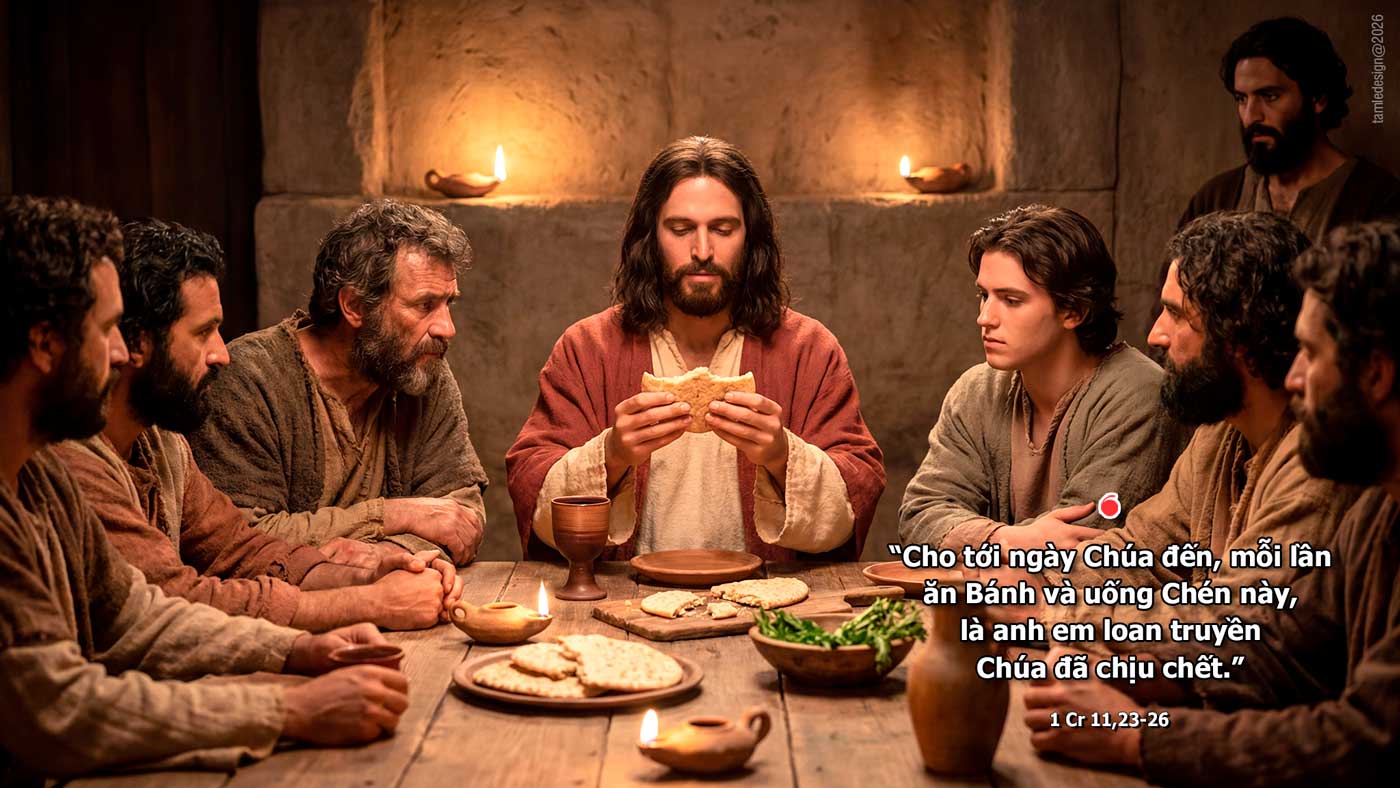 Thưa anh em, điều tôi đã lãnh nhận từ nơi Chúa, tôi xin truyền lại cho anh em: trong đêm bị nộp, Chúa Giê-su cầm lấy bánh, dâng lời chúc tụng tạ ơn, rồi bẻ ra và nói: “Anh em cầm lấy mà ăn, đây là Mình Thầy, hiến tế vì anh em; anh em hãy làm như Thầy vừa làm để tưởng nhớ đến Thầy.” Cũng thế, cuối bữa ăn, Người nâng chén và nói: “Đây là chén Máu Thầy, Máu đổ ra để lập Giao Ước Mới; mỗi khi uống, anh em hãy làm như Thầy vừa làm để tưởng nhớ đến Thầy.” Thật vậy, cho tới ngày Chúa đến, mỗi lần ăn Bánh và uống Chén này, là anh em loan truyền Chúa đã chịu chết. Đó là lời Chúa.