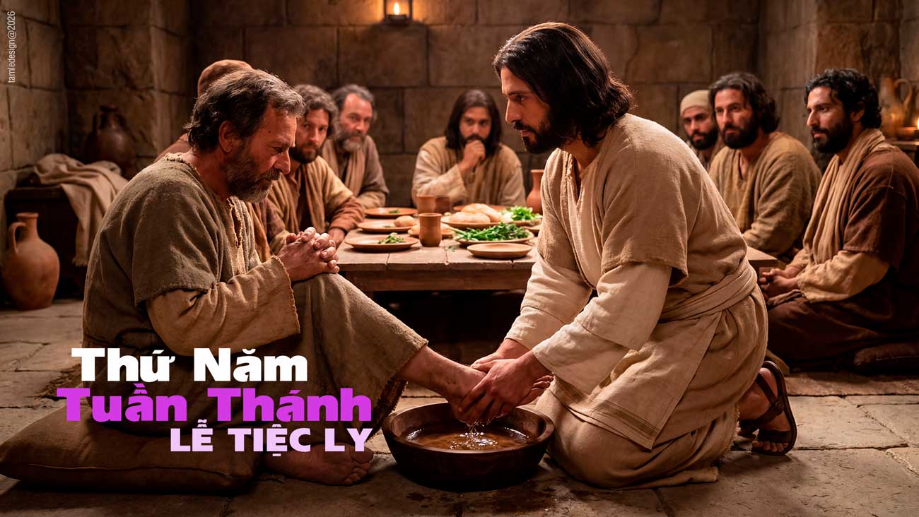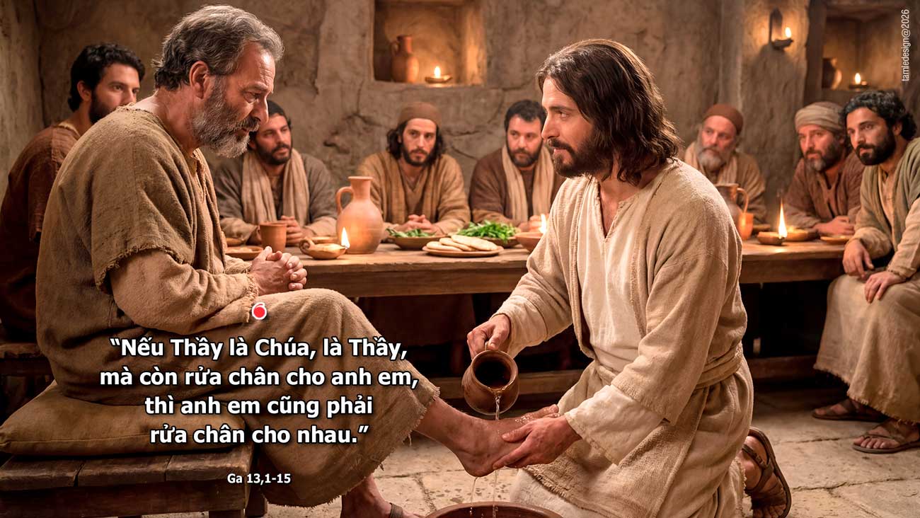 Trước lễ Vượt Qua, Đức Giê-su biết giờ của Người đã đến, giờ phải bỏ thế gian mà về với Chúa Cha. Người vẫn yêu thương những kẻ thuộc về mình còn ở thế gian, và Người yêu thương họ đến cùng. Ma quỷ đã gieo vào lòng Giu-đa, con ông Si-mon Ít-ca-ri-ốt, ý định nộp Đức Giê-su. Đức Giê-su biết rằng: Chúa Cha đã giao phó mọi sự trong tay Người, Người bởi Thiên Chúa mà đến, và sắp trở về cùng Thiên Chúa, nên trong một bữa ăn Người đứng dậy, rời bàn ăn, cởi áo ngoài ra, và lấy khăn mà thắt lưng. Rồi Đức Giê-su đổ nước vào chậu, bắt đầu rửa chân cho các môn đệ và lấy khăn thắt lưng mà lau. Vậy, Người đến chỗ ông Si-mon Phê-rô, ông liền thưa với Người: “Thưa Thầy! Thầy mà lại rửa chân cho con sao?” Đức Giê-su trả lời: “Việc Thầy làm, bây giờ anh chưa hiểu, nhưng sau này anh sẽ hiểu.” Ông Phê-rô lại thưa: “Thầy mà rửa chân cho con, không đời nào con chịu đâu!” Đức Giê-su đáp: “Nếu Thầy không rửa cho anh, anh sẽ chẳng được chung phần với Thầy.” Ông Si-mon Phê-rô liền thưa: “Vậy, thưa Thầy, xin cứ rửa, không những chân, mà cả tay và đầu con nữa.” Đức Giê-su bảo ông: “Ai đã tắm rồi, thì không cần phải rửa nữa; toàn thân người ấy đã sạch. Về phần anh em, anh em đã sạch, nhưng không phải tất cả đâu!” Thật vậy, Người biết ai sẽ nộp Người, nên mới nói: “Không phải tất cả anh em đều sạch.” Khi rửa chân cho các môn đệ xong, Đức Giê-su mặc áo vào, về chỗ và nói: “Anh em có hiểu việc Thầy mới làm cho anh em không? Anh em gọi Thầy là ‘Thầy’, là ‘Chúa’, điều đó phải lắm, vì quả thật, Thầy là Thầy, là Chúa. Vậy, nếu Thầy là Chúa, là Thầy, mà còn rửa chân cho anh em, thì anh em cũng phải rửa chân cho nhau. Thầy đã nêu gương cho anh em, để anh em cũng làm như Thầy đã làm cho anh em. Đó là lời Chúa.