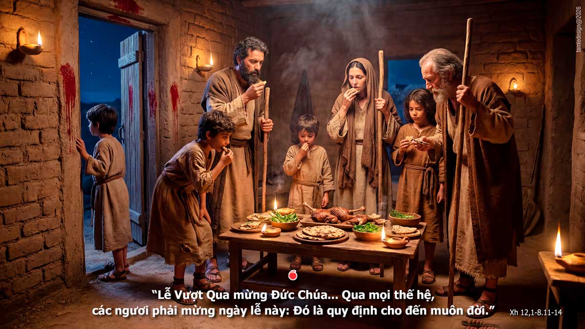 Ngày ấy, Đức Chúa phán với ông Mô-sê và ông A-ha-ron trên đất Ai-cập: “Tháng này, các ngươi phải kể là tháng đứng đầu các tháng, tháng thứ nhất trong năm. Hãy nói với toàn thể cộng đồng Ít-ra-en: Mồng mười tháng này, ai nấy phải bắt một con chiên cho gia đình mình, mỗi nhà một con. Nếu nhà ít người, không ăn hết một con, thì chung với người hàng xóm gần nhà mình nhất, tùy theo số người. Các ngươi sẽ tùy theo sức mỗi người ăn được bao nhiêu mà chọn con chiên. Con chiên đó phải toàn vẹn, phải là con đực, không quá một tuổi. Các ngươi bắt chiên hay dê cũng được. Phải nhốt nó cho tới ngày mười bốn tháng này, rồi toàn thể đại hội cộng đồng Ít-ra-en đem sát tế vào lúc xế chiều, lấy máu bôi lên khung cửa những nhà có ăn thịt chiên. Còn thịt, sẽ ăn ngay đêm ấy, nướng lên, ăn với bánh không men và rau đắng. Các ngươi phải ăn thế này: lưng thắt gọn, chân đi dép, tay cầm gậy. Các ngươi phải ăn vội vã: đó là lễ Vượt Qua mừng Đức Chúa. Đêm ấy Ta sẽ rảo khắp đất Ai-cập, sẽ sát hại các con đầu lòng trong đất Ai-cập, từ loài người cho đến loài thú vật, và sẽ trị tội chư thần Ai-cập: vì Ta là Đức Chúa. Còn vết máu trên nhà các ngươi sẽ là dấu hiệu cho biết có các ngươi ở đó. Thấy máu, Ta sẽ vượt qua, và các ngươi sẽ không bị tai ương tiêu diệt khi Ta giáng hoạ trên đất Ai-cập. Các ngươi phải lấy ngày đó làm ngày tưởng niệm, ngày đại lễ mừng Đức Chúa. Qua mọi thế hệ, các ngươi phải mừng ngày lễ này: đó là quy định cho đến muôn đời. Đó là lời Chúa.