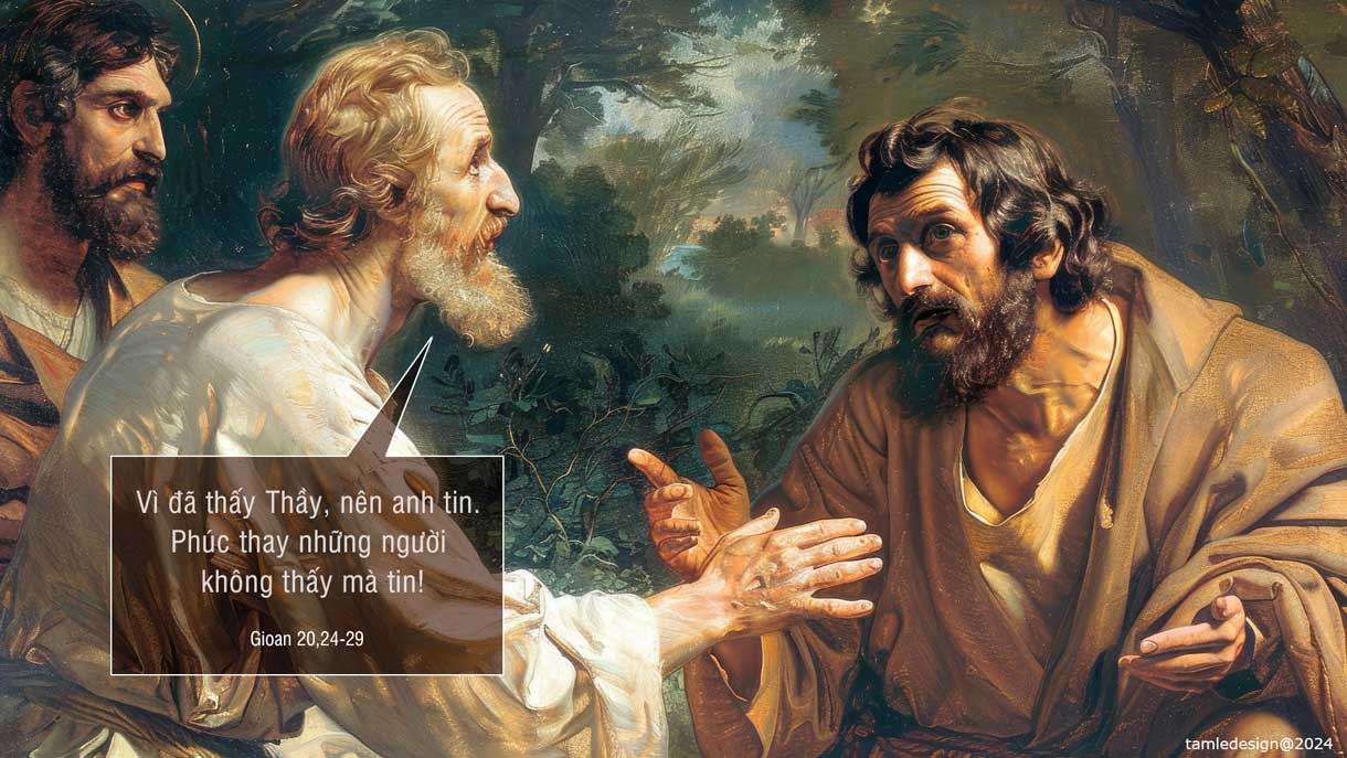 Có một người trong Nhóm Mười Hai, tên là Tô-ma, cũng gọi là Đi-đy-mô, không ở với các ông khi Đức Giê-su đến. Các môn đệ khác nói với ông: “Chúng tôi đã được thấy Chúa!” Ông Tô-ma đáp: “Nếu tôi không thấy dấu đinh ở tay Người, nếu tôi không xỏ ngón tay vào lỗ đinh và không đặt bàn tay vào cạnh sườn Người, tôi chẳng có tin.” Tám ngày sau, các môn đệ Đức Giê-su lại có mặt trong nhà, có cả ông Tô-ma ở đó với các ông. Các cửa đều đóng kín. Đức Giê-su đến, đứng giữa các ông và nói: “Bình an cho anh em!” Rồi Người bảo ông Tô-ma: “Đặt ngón tay vào đây, và hãy nhìn xem tay Thầy. Đưa tay ra mà đặt vào cạnh sườn Thầy. Đừng cứng lòng nữa, nhưng hãy tin.” Ông Tô-ma thưa Người: “Lạy Chúa của con, lạy Thiên Chúa của con!” Đức Giê-su bảo: “Vì đã thấy Thầy, nên anh tin. Phúc thay những người không thấy mà tin!” Đó là lời Chúa.