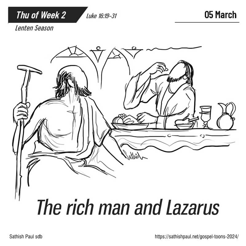 Khi ấy, Đức Giê-su nói với người Pha-ri-sêu dụ ngôn sau đây: “Có một ông nhà giàu kia, mặc toàn lụa là gấm vóc, ngày ngày yến tiệc linh đình. Lại có một người nghèo khó tên là La-da-rô, mụn nhọt đầy mình, nằm trước cổng ông nhà giàu, thèm được những thứ trên bàn ăn của ông ấy rớt xuống mà ăn cho no. Lại thêm mấy con chó cứ đến liếm ghẻ chốc anh ta. Thế rồi người nghèo này chết, và được thiên thần đem vào lòng ông Áp-ra-ham. Ông nhà giàu cũng chết, và người ta đem chôn. Dưới âm phủ, đang khi chịu cực hình, ông ta ngước mắt lên, thấy tổ phụ Áp-ra-ham ở tận đàng xa, và thấy anh La-da-rô trong lòng tổ phụ. Bấy giờ ông ta kêu lên: “Lạy tổ phụ Áp-ra-ham, xin thương xót con, và sai anh La-da-rô nhúng đầu ngón tay vào nước, nhỏ trên lưỡi con cho mát; vì ở đây con bị lửa thiêu đốt khổ lắm!” Ông Áp-ra-ham đáp: “Con ơi, hãy nhớ lại: suốt đời con, con đã nhận phần phước của con rồi; còn La-da-rô suốt một đời chịu toàn những bất hạnh. Bây giờ, La-da-rô được an ủi nơi đây, còn con thì phải chịu khốn khổ. Hơn nữa, giữa chúng ta đây và các con đã có một vực thẳm lớn, đến nỗi bên này muốn qua bên các con cũng không được, mà bên đó có qua bên chúng ta đây cũng không được”. Ông nhà giàu nói: “Lạy tổ phụ, vậy thì con xin tổ phụ sai anh La-da-rô đến nhà cha con, vì con hiện còn năm người anh em nữa. Xin sai anh đến cảnh cáo họ, kẻo họ lại cũng sa vào chốn cực hình này!” Ông Áp-ra-ham đáp: “Chúng đã có Mô-sê và các Ngôn Sứ, thì chúng cứ nghe lời các vị đó”. Ông nhà giàu nói: “Thưa tổ phụ Áp-ra-ham, họ không chịu nghe đâu, nhưng nếu có người từ cõi chết đến với họ, thì họ sẽ ăn năn sám hối”. Ông Áp-ra-ham đáp: “Mô-sê và các Ngôn Sứ mà họ còn chẳng chịu nghe, thì người chết có sống lại, họ cũng chẳng chịu tin”. Đó là lời Chúa.