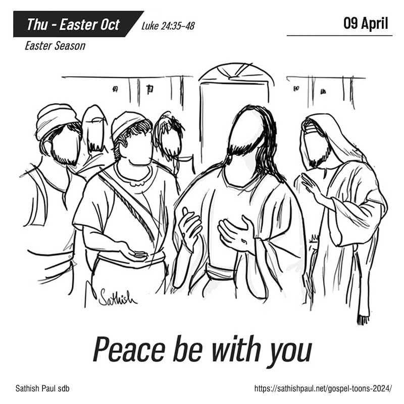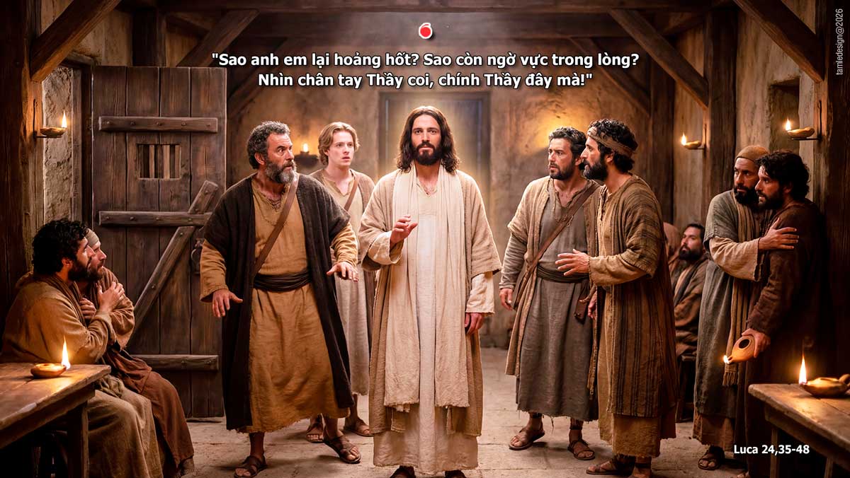 Bấy giờ, hai môn đệ từ Em-mau trở về, thuật lại những gì đã xảy ra dọc đường, và việc mình đã nhận ra Chúa thế nào khi Người bẻ bánh. Các ông còn đang nói, thì chính Đức Giê-su đứng giữa các ông và bảo: “Bình an cho anh em!” Các ông kinh hồn bạt vía, tưởng là thấy ma. Nhưng Người nói: “Sao anh em lại hoảng hốt? Sao còn ngờ vực trong lòng? Nhìn chân tay Thầy coi, chính Thầy đây mà! Cứ rờ xem, ma đâu có xương có thịt như anh em thấy Thầy có đây?” Nói xong, Người đưa tay chân ra cho các ông xem. Vì mừng quá, các ông vẫn chưa tin và còn đang ngỡ ngàng, thì Người hỏi: “Ở đây anh em có gì ăn không?” Các ông đưa cho Người một khúc cá nướng. Người cầm lấy và ăn trước mặt các ông. Rồi Người bảo: “Khi còn ở với anh em, Thầy đã từng nói với anh em rằng tất cả những gì sách Luật Mô-sê, các Sách Ngôn Sứ và các Thánh Vịnh đã chép về Thầy đều phải được ứng nghiệm”. Bấy giờ Người mở trí cho các ông hiểu Kinh Thánh và bảo: “Có lời Kinh Thánh chép rằng: Đấng Ki-tô phải chịu khổ hình, rồi ngày thứ ba, từ cõi chết sống lại, và phải nhân danh Người mà rao giảng cho muôn dân, bắt đầu từ Giê-ru-sa-lem, kêu gọi họ sám hối để được ơn tha tội. Chính anh em là chứng nhân của những điều này. Đó là lời Chúa.