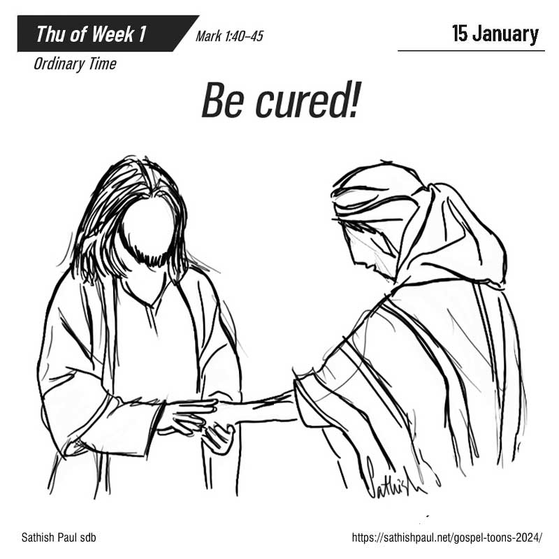 En ce temps-là, un lépreux vint auprès de Jésus ; il le supplia et, tombant à ses genoux, lui dit : « Si tu le veux, tu peux me purifier. » Saisi de compassion, Jésus étendit la main, le toucha et lui dit : « Je le veux, sois purifié. » À l’instant même, la lèpre le quitta et il fut purifié. Avec fermeté, Jésus le renvoya aussitôt en lui disant : « Attention, ne dis rien à personne, mais va te montrer au prêtre, et donne pour ta purification ce que Moïse a prescrit dans la Loi : cela sera pour les gens un témoignage. » (Mc 1, 40-45)