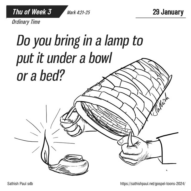 « Est-ce que la lampe est apportée pour être mise sous le boisseau ou sous le lit ? N’est-ce pas pour être mise sur le lampadaire ? Car rien n’est caché, sinon pour être manifesté ; rien n’a été gardé secret, sinon pour venir à la clarté. Si quelqu’un a des oreilles pour entendre, qu’il entende ! » (Mc 4, 21-25)