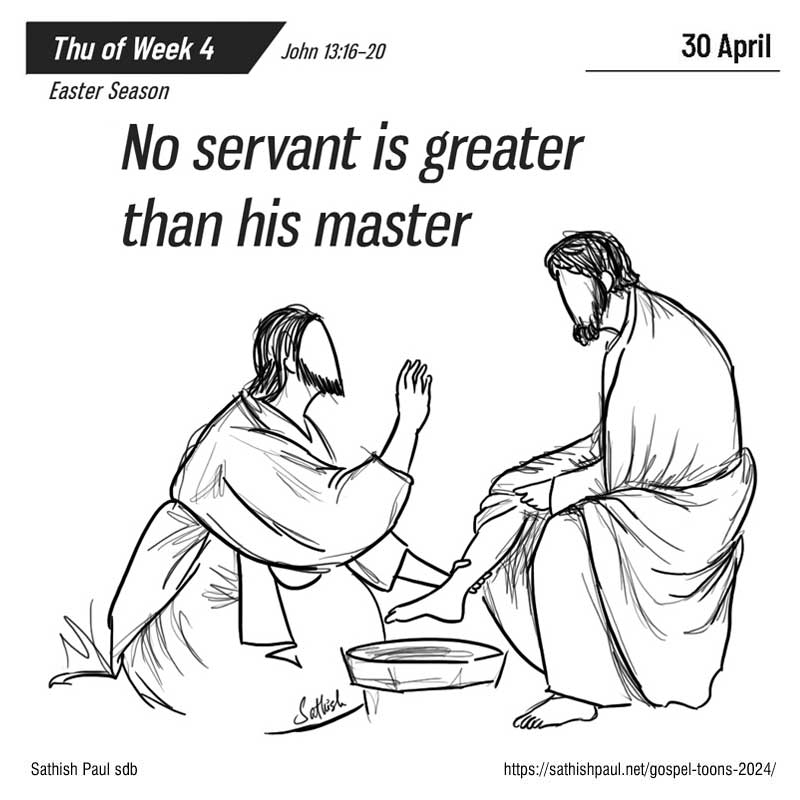 Sau khi rửa chân cho các môn đệ, Đức Giê-su nói: “Thật, Thầy bảo thật anh em: tôi tớ không lớn hơn chủ nhà, kẻ được sai đi không lớn hơn người sai đi. Anh em đã biết những điều đó, nếu anh em thực hành, thì thật phúc cho anh em! Thầy không nói về tất cả anh em đâu. Chính Thầy biết những người Thầy đã chọn, nhưng phải ứng nghiệm lời Kinh Thánh sau đây: Kẻ đã cùng con chia cơm sẻ bánh lại giơ gót đạp con. Thầy nói với anh em điều đó ngay từ lúc này, trước khi sự việc xảy ra, để khi sự việc xảy ra, anh em tin là Thầy Hằng Hữu. Thật, Thầy bảo thật anh em: ai đón tiếp người Thầy sai đến là đón tiếp Thầy, và ai đón tiếp Thầy là đón tiếp Đấng đã sai Thầy.” Đó là lời Chúa.