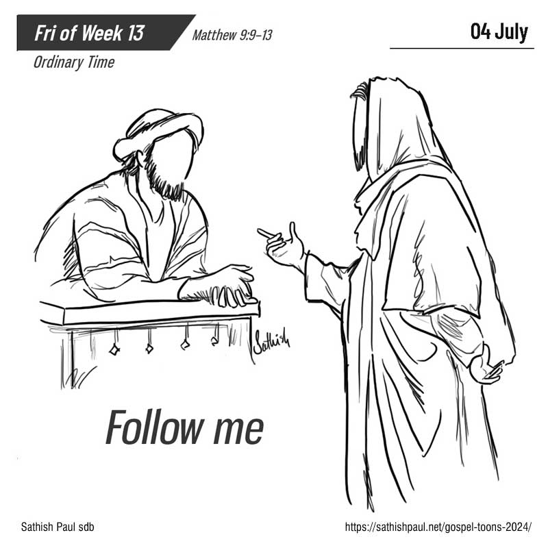 Khi ấy, Đức Giê-su đi ngang qua trạm thu thuế, thì thấy một người tên là Mát-thêu đang ngồi tại trạm. Người bảo ông: “Anh hãy theo tôi! ” Ông đứng dậy đi theo Người. Khi Đức Giê-su đang dùng bữa tại nhà ông ấy, có nhiều người thu thuế và tội lỗi kéo đến, cùng ăn với Người và các môn đệ. Thấy vậy, những người Pha-ri-sêu nói với các môn đệ Người rằng: “Tại sao Thầy các anh lại ăn uống với bọn thu thuế, và quân tội lỗi?” Nghe thấy thế, Đức Giê-su nói: “Người khoẻ mạnh không cần thầy thuốc, người đau ốm mới cần. Hãy về học cho biết ý nghĩa của câu này: “Ta muốn lòng nhân chứ đâu cần lễ tế. Vì tôi không đến để kêu gọi người công chính, mà để kêu gọi người tội lỗi.” Đó là lời Chúa.