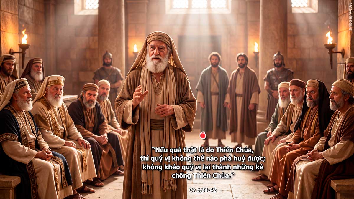 Bấy giờ có một người Pha-ri-sêu tên là Ga-ma-li-ên đứng lên giữa Thượng Hội Đồng; ông là một kinh sư được toàn dân kính trọng. Ông truyền đưa các đương sự ra ngoài một lát. Rồi ông nói với Thượng Hội Đồng: “Thưa quý vị là người Ít-ra-en, xin quý vị coi chừng điều quý vị sắp làm cho những người này. Thời gian trước đây, có Thêu-đa nổi lên, xưng mình là một nhân vật và kết nạp được khoảng bốn trăm người; ông ta đã bị giết, và mọi kẻ theo ông cũng tan rã, không còn gì hết. Sau ông, có Giu-đa người Ga-li-lê nổi lên vào thời kiểm tra dân số, và lôi cuốn dân đi với mình; cả ông này cũng bị diệt, và tất cả những người theo ông ta đều bị tan tác. Vậy giờ đây, tôi xin nói với quý vị: hãy để mặc những người này. Cứ cho họ về, vì nếu ý định hay công việc này là do người phàm, tất sẽ bị phá huỷ; còn nếu quả thật là do Thiên Chúa, thì quý vị không thể nào phá huỷ được; không khéo quý vị lại thành những kẻ chống Thiên Chúa.” Họ tán thành ý kiến của ông. Họ cho gọi các Tông Đồ lại mà đánh đòn và cấm các ông không được nói đến danh Đức Giê-su, rồi thả các ông ra. Các Tông Đồ ra khỏi Thượng Hội Đồng, lòng hân hoan bởi được coi là xứng đáng chịu khổ nhục vì danh Đức Giê-su. Mỗi ngày, trong Đền Thờ và tại tư gia, các ông không ngừng giảng dạy và loan báo Tin Mừng về Đức Ki-tô Giê-su. Đó là lời Chúa.