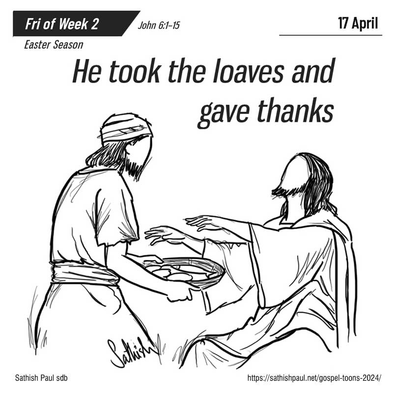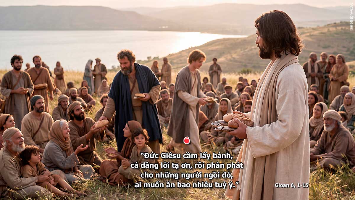 Bấy giờ, Đức Giê-su sang bên kia Biển Hồ Ga-li-lê, cũng gọi là Biển Hồ Ti-bê-ri-a. Có đông đảo dân chúng đi theo Người, bởi họ từng được chứng kiến những dấu lạ Người đã làm cho những kẻ đau ốm. Đức Giê-su lên núi và ngồi đó với các môn đệ. Lúc ấy, sắp đến lễ Vượt Qua là đại lễ của người Do-thái. Ngước mắt lên, Đức Giê-su nhìn thấy đông đảo dân chúng đến với mình. Người hỏi ông Phi-líp-phê: “Ta mua đâu ra bánh cho họ ăn đây?” Người nói thế là để thử ông, chứ Người đã biết mình sắp làm gì rồi. Ông Phi-líp-phê đáp: “Thưa, có mua đến hai trăm đồng bạc bánh cũng chẳng đủ cho mỗi người một chút.” Một trong các môn đệ, là ông An-rê, anh ông Si-mon Phê-rô, thưa với Người: “Ở đây có một em bé có năm chiếc bánh lúa mạch và hai con cá, nhưng với bằng ấy người thì thấm vào đâu!” Đức Giê-su nói: “Anh em cứ bảo người ta ngồi xuống đi.” Chỗ ấy có nhiều cỏ. Người ta ngồi xuống, nguyên số đàn ông đã tới khoảng năm ngàn. Vậy, Đức Giê-su cầm lấy bánh, dâng lời tạ ơn, rồi phân phát cho những người ngồi đó. Cá nhỏ, Người cũng phân phát như vậy, ai muốn ăn bao nhiêu tuỳ ý. Khi họ đã no nê rồi, Người bảo các môn đệ: “Anh em thu lại những miếng thừa kẻo phí đi.” Họ liền đi thu những miếng thừa của năm chiếc bánh lúa mạch người ta ăn còn lại, và chất đầy được mười hai thúng. Dân chúng thấy dấu lạ Đức Giê-su làm thì nói: “Hẳn ông này là vị ngôn sứ, Đấng phải đến thế gian!” Nhưng Đức Giê-su biết họ sắp đến bắt mình đem đi mà tôn làm vua, nên Người lại lánh mặt, đi lên núi một mình. Đó là lời Chúa.