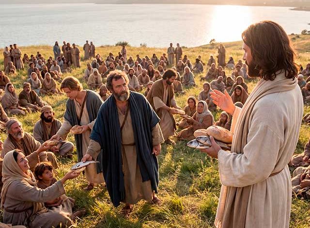 Un de ses disciples, André, le frère de Simon-Pierre, lui dit : « Il y a là un jeune garçon qui a cinq pains d’orge et deux poissons, mais qu’est-ce que cela pour tant de monde ! » Jésus dit : « Faites asseoir les gens. » Il y avait beaucoup d’herbe à cet endroit. Ils s’assirent donc, au nombre d’environ cinq mille hommes. (Jn 6, 1-15)