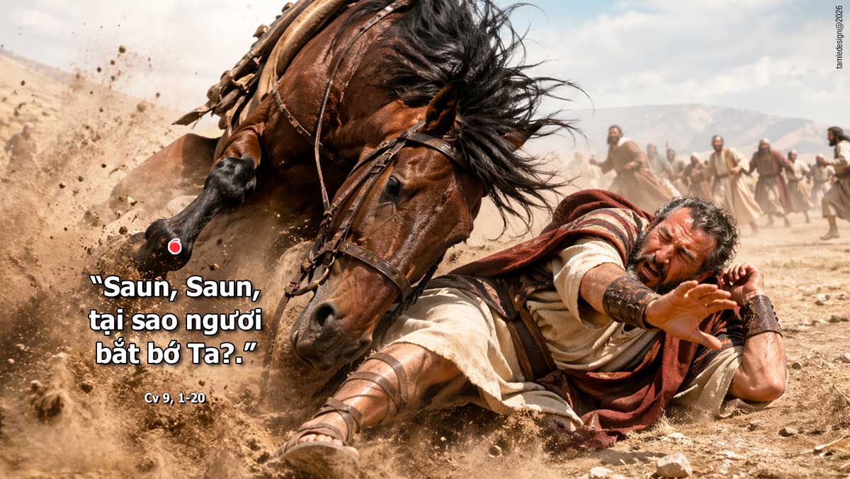 Bấy giờ, ông Sao-lô vẫn còn hằm hằm đe doạ giết các môn đệ Chúa, nên đã tới gặp thượng tế xin thư giới thiệu đến các hội đường ở Đa-mát, để nếu thấy những người theo Đạo, bất luận đàn ông hay đàn bà, thì bắt trói giải về Giê-ru-sa-lem. Vậy đang khi ông đi đường và đến gần Đa-mát, thì bỗng nhiên có một luồng ánh sáng từ trời chiếu xuống bao phủ lấy ông. Ông ngã xuống đất và nghe có tiếng nói với ông: “Sa-un, Sa-un, tại sao ngươi bắt bớ Ta?” Ông nói: “Thưa Ngài, Ngài là ai?” Người đáp: “Ta là Giê-su mà ngươi đang bắt bớ. Nhưng ngươi hãy đứng dậy, vào thành, và người ta sẽ nói cho ngươi biết ngươi phải làm gì.” Những người cùng đi với ông dừng lại, sững sờ: họ nghe có tiếng nói, nhưng không trông thấy ai. Ông Sao-lô từ dưới đất đứng dậy, mắt thì mở nhưng không thấy gì. Người ta phải cầm tay dắt ông vào Đa-mát. Suốt ba ngày, ông không nhìn thấy, cũng chẳng ăn, chẳng uống. Bấy giờ ở Đa-mát có một môn đệ tên là Kha-na-ni-a. Trong một thị kiến, Chúa phán với ông: “Kha-na-ni-a!” Ông thưa: “Dạ, lạy Chúa, con đây.” Chúa bảo ông: “Đứng lên, đi tới phố gọi là phố Thẳng, đến nhà Giu-đa tìm một người tên là Sao-lô quê ở Tác-xô, vì kìa, người ấy đang cầu nguyện và thấy một người tên là Kha-na-ni-a đi vào, đặt tay trên mình để làm cho mình lại thấy được.” Ông Kha-na-ni-a thưa: “Lạy Chúa, con đã nghe lắm kẻ nói về người ấy, về tất cả những điều ác người ấy đã làm cho các thánh Chúa tại Giê-ru-sa-lem. Còn ở đây, người ấy được các thượng tế cho quyền bắt trói tất cả những ai kêu cầu danh Chúa.” Nhưng Chúa phán với ông: “Cứ đi, vì người ấy là lợi khí Ta chọn để mang danh Ta đến trước mặt các dân ngoại, các vua chúa và con cái Ít-ra-en. Thật vậy, chính Ta sẽ chỉ cho người ấy thấy tất cả những đau khổ người ấy phải chịu vì danh Ta.” Ông Kha-na-ni-a liền đi; ông vào nhà, đặt tay trên ông Sao-lô và nói: “Anh Sa-un, Chúa đã sai tôi đến đây, Người là Đức Giê-su, Đấng đã hiện ra với anh trên đường anh tới đây. Người sai tôi đến để anh lại thấy được và để anh được đầy Thánh Thần.” Lập tức có những cái gì như vảy bong ra khỏi mắt ông Sao-lô, và ông lại thấy được. Ông đứng dậy và chịu phép rửa. Rồi ông ăn và khoẻ lại. Ông ở lại Đa-mát với các môn đệ mấy hôm, rồi lập tức ông bắt đầu rao giảng Đức Giê-su trong các hội đường, rằng Người là Con Thiên Chúa. Đó là lời Chúa.