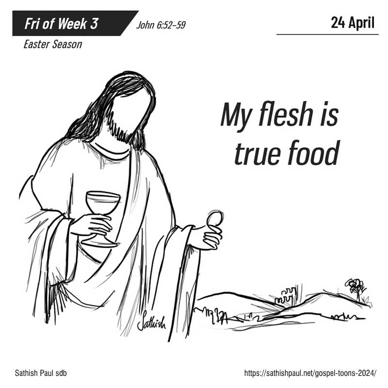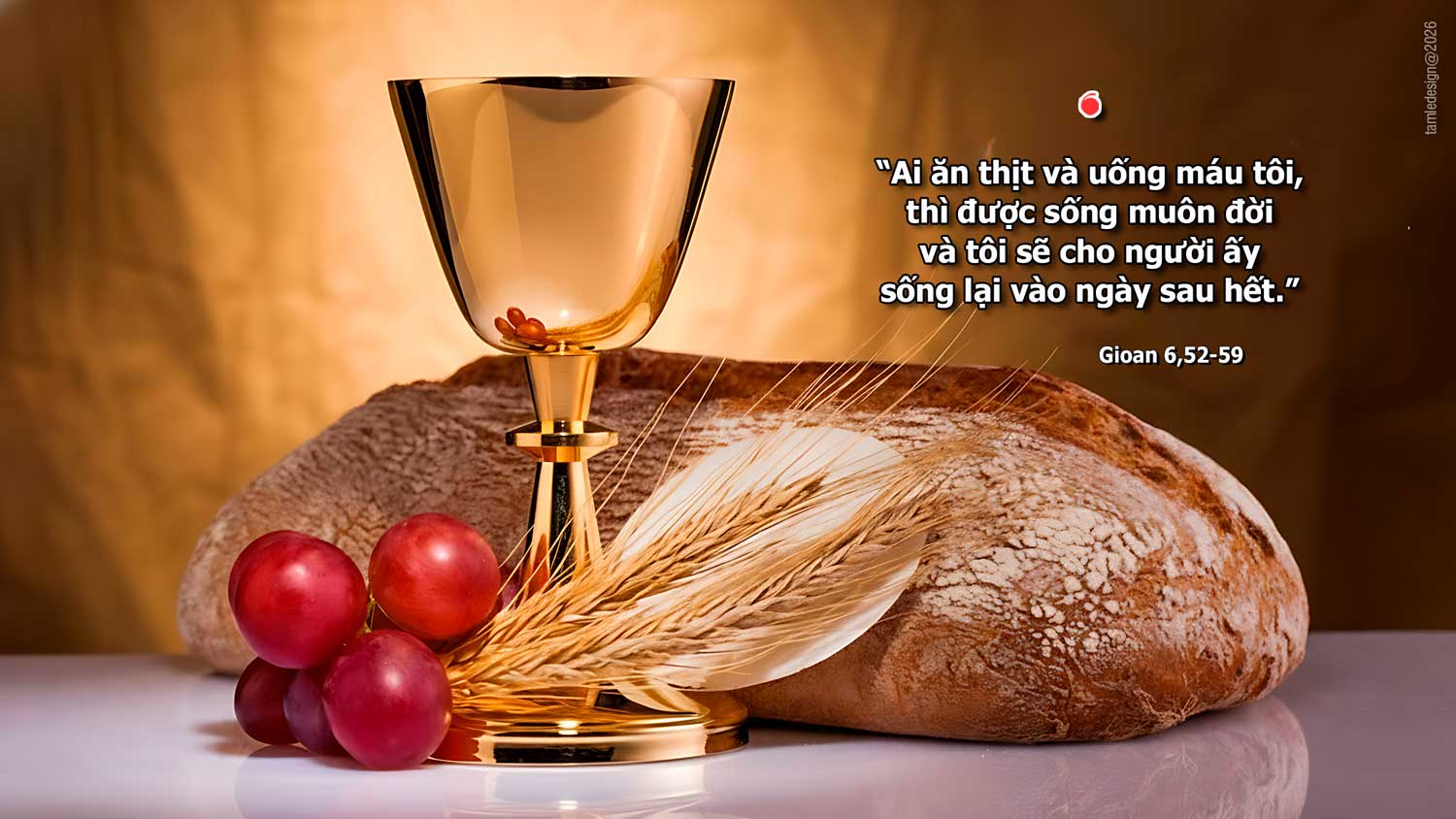 Hồi ấy, người Do-thái liền tranh luận sôi nổi với nhau. Họ nói: “Làm sao ông này có thể cho chúng ta ăn thịt ông ta được?” Đức Giê-su nói với họ: “Thật, tôi bảo thật các ông: nếu các ông không ăn thịt và uống máu Con Người, các ông không có sự sống nơi mình. Ai ăn thịt và uống máu tôi, thì được sống muôn đời, và tôi sẽ cho người ấy sống lại vào ngày sau hết, vì thịt tôi thật là của ăn, và máu tôi thật là của uống. Ai ăn thịt và uống máu tôi, thì ở lại trong tôi, và tôi ở lại trong người ấy. Như Chúa Cha là Đấng hằng sống đã sai tôi, và tôi sống nhờ Chúa Cha thế nào, thì kẻ ăn tôi, cũng sẽ nhờ tôi mà được sống như vậy. Đây là bánh từ trời xuống, không phải như bánh tổ tiên các ông đã ăn, và họ đã chết. Ai ăn bánh này, sẽ được sống muôn đời.” Đó là những điều Đức Giê-su đã nói khi giảng dạy trong hội đường, ở Ca-phác-na-um. Đó là lời Chúa.
