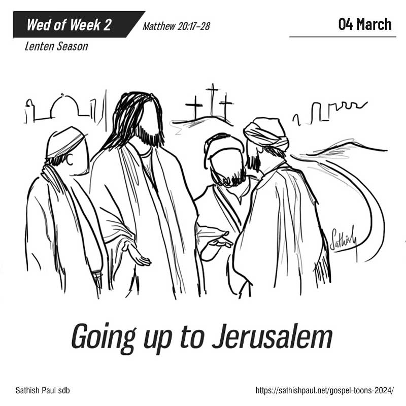 Lúc sắp lên Giê-ru-sa-lem, Đức Giê-su đưa Nhóm Mười Hai đi riêng với mình, và dọc đường, Người nói với các ông: “Này chúng ta lên Giê-ru-sa-lem, và Con Người sẽ bị nộp cho các thượng tế và kinh sư. Họ sẽ kết án tử hình Người, sẽ nộp Người cho dân ngoại nhạo báng, đánh đòn và đóng đinh vào Thập giá và, ngày thứ ba, Người sẽ chỗi dậy”. Bấy giờ bà mẹ của các con ông Dê-bê-đê đến gặp Đức Giê-su, có các con bà đi theo; bà bái lạy và kêu xin Người một điều. Người hỏi bà: “Bà muốn gì?” Bà thưa: “Xin Thầy truyền cho hai con tôi đây, một người ngồi bên hữu, một người bên tả Thầy trong Nước Thầy”. Đức Giê-su bảo: “Các người không biết các người xin gì! Các người có uống nổi chén Thầy sắp uống không?” Họ đáp: “Thưa uống nổi”. Đức Giê-su bảo: “Chén của Thầy, các người sẽ uống; còn việc ngồi bên hữu hay bên tả Thầy, thì Thầy không có quyền cho; Cha Thầy đã chuẩn bị cho ai, thì kẻ ấy mới được”. Nghe vậy, mười môn đệ kia tức tối với hai anh em đó. Nhưng Đức Giê-su gọi các ông lại và nói: “Anh em biết: thủ lãnh các dân thì lấy quyền mà thống trị dân, những người làm lớn thì dùng uy mà cai quản dân. Giữa anh em thì không được như vậy: Ai muốn làm lớn giữa anh em, thì phải làm người phục vụ anh em. Và ai muốn làm đầu anh em thì phải làm đầy tớ anh em. Cũng như Con Người đến không phải để được người ta phục vụ, nhưng là để phục vụ và hiến dâng mạng sống làm giá chuộc muôn người”. Đó là lời Chúa.