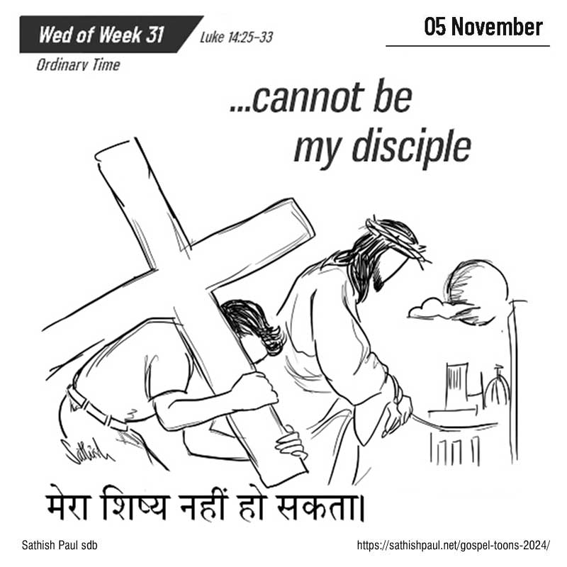 Khi ấy, có rất đông người cùng đi đường với Đức Giê-su. Người quay lại bảo họ: “Ai đến với tôi mà không dứt bỏ cha mẹ, vợ con, anh em, chị em, và cả mạng sống mình nữa, thì không thể làm môn đệ tôi được. Ai không vác thập giá mình mà đi theo tôi, thì không thể làm môn đệ tôi được”. Quả thế, ai trong anh em muốn xây một cây tháp, mà trước tiên lại không ngồi xuống tính toán phí tổn, xem mình có đủ để hoàn thành không? Kẻo lỡ ra, đặt móng rồi mà không có khả năng làm xong, thì mọi người thấy vậy sẽ lên tiếng chê cười mà bảo: “Anh ta đã khởi công xây, mà chẳng có sức làm cho xong việc”. Hoặc có vua nào đi giao chiến với một vua khác, mà trước tiên lại không ngồi xuống bàn tính xem mình có thể đem một vạn quân ra, đương đầu với đối phương dẫn hai vạn quân tiến đánh mình chăng? Nếu không đủ sức, thì khi đối phương còn ở xa, ắt nhà vua đã phải sai sứ đi cầu hoà. Cũng vậy, ai trong anh em không từ bỏ hết những gì mình có, thì không thể làm môn đệ tôi được”. Đó là lời Chúa.