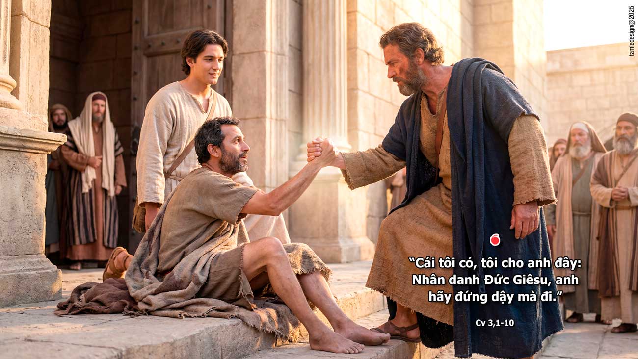 Một hôm, ông Phê-rô và ông Gio-an lên Đền Thờ, vào buổi cầu nguyện giờ thứ chín. Khi ấy, người ta khiêng đến một người què từ khi lọt lòng mẹ. Ngày ngày họ đặt anh ta bên cửa Đền Thờ gọi là Cửa Đẹp, để xin kẻ ra vào Đền Thờ bố thí. Vừa thấy ông Phê-rô và ông Gio-an sắp vào Đền Thờ, anh liền xin bố thí. Ông Phê-rô cùng với ông Gio-an nhìn thẳng vào anh và nói: “Anh nhìn chúng tôi đây!” Anh ta chăm chú nhìn hai ông, tưởng rằng sẽ được cái gì. Bấy giờ ông Phê-rô nói: “Vàng bạc thì tôi không có; nhưng cái tôi có, tôi cho anh đây: nhân danh Đức Giê-su Ki-tô người Na-da-rét, anh đứng dậy mà đi!” Rồi ông nắm chặt lấy tay mặt anh, kéo anh chỗi dậy. Lập tức bàn chân và xương mắt cá của anh trở nên cứng cáp. Anh đứng phắt dậy, đi lại được; rồi cùng với hai ông, anh vào Đền Thờ, vừa đi vừa nhảy nhót và ca tụng Thiên Chúa. Toàn dân thấy anh đi lại và ca tụng Thiên Chúa. Và khi nhận ra anh chính là người vẫn ngồi ăn xin tại Cửa Đẹp Đền Thờ, họ kinh ngạc sững sờ về sự việc mới xảy đến cho anh. Đó là lời Chúa.