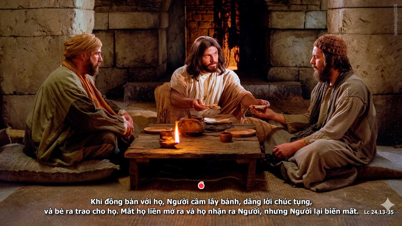 Vào ngày thứ nhất trong tuần, có hai người trong nhóm môn đệ đi đến một làng kia tên là Em-mau, cách Giê-ru-sa-lem chừng mười một cây số. Họ trò chuyện với nhau về tất cả những sự việc mới xảy ra. Đang lúc họ trò chuyện và bàn tán, thì chính Đức Giê-su tiến đến gần và cùng đi với họ. Nhưng mắt họ còn bị ngăn cản, không nhận ra Người. Người hỏi họ: “Các anh vừa đi vừa trao đổi với nhau về chuyện gì vậy?” Họ dừng lại, vẻ mặt buồn rầu. Một trong hai người tên là Cơ-lê-ô-pát trả lời: “Chắc ông là người duy nhất trú ngụ tại Giê-ru-sa-lem mà không hay biết những chuyện đã xảy ra trong thành mấy bữa nay”. Đức Giê-su hỏi: “Chuyện gì vậy?” Họ thưa: “Chuyện ông Giê-su Na-da-rét. Người là một ngôn sứ đầy uy thế trong việc làm cũng như lời nói trước mặt Thiên Chúa và toàn dân. Thế mà các thượng tế và thủ lãnh của chúng ta đã nộp Người để Người bị án tử hình, và đã đóng đinh Người vào thập giá. Phần chúng tôi, trước đây vẫn hy vọng rằng chính Người là Đấng sẽ cứu chuộc Ít-ra-en. Hơn nữa, những việc ấy xảy ra đến nay là ngày thứ ba rồi. Thật ra, cũng có mấy người đàn bà trong nhóm chúng tôi đã làm chúng tôi kinh ngạc. Các bà ấy ra mộ hồi sáng sớm, không thấy xác Người đâu cả, về còn nói là đã thấy thiên thần hiện ra bảo rằng Người vẫn sống. Vài người trong nhóm chúng tôi đã ra mộ, và thấy sự việc y như các bà ấy nói; còn chính Người thì họ không thấy”. Bấy giờ Đức Giê-su nói với hai ông rằng: “Các anh chẳng hiểu gì cả! Lòng trí các anh thật là chậm tin vào lời các ngôn sứ! Nào Đấng Ki-tô lại chẳng phải chịu khổ hình như thế, rồi mới vào trong vinh quang của Người sao? Rồi bắt đầu từ ông Mô-sê và tất cả các ngôn sư, Người giải thích cho hai ông những gì liên quan đến Người trong tất cả Sách Thánh. Khi gần tới làng họ muốn đến, Đức Giê-su làm như còn phải đi xa hơn nữa. Họ nài ép Người rằng: “Mời ông ở lại với chúng tôi, vì trời đã xế chiều, và ngày sắp tàn”. Bấy giờ Người mới vào và ở lại với họ. Khi đồng bàn với họ, Người cầm lấy bánh, dâng lời chúc tụng, và bẻ ra trao cho họ. Mắt họ liền mở ra và họ nhận ra Người, nhưng Người lại biến mất. Họ mới bảo nhau: “Dọc đường, khi Người nói chuyện và giải thích Kinh Thánh cho chúng ta, lòng chúng ta đã chẳng bừng cháy lên sao?” Ngay lúc ấy, họ đứng dậy, quay trở lại Giê-ru-sa-lem, gặp Nhóm Mười Một và các bạn hữu đang tụ họp tại đó. Những người này bảo hai ông: “Chúa chỗi dậy thật rồi, và đã hiện ra với ông Si-mon”. Còn hai ông thì thuật lại những việc đã xảy ra dọc đường, và mình đã nhận ra Chúa thế nào khi Người bẻ bánh. Đó là lời Chúa.