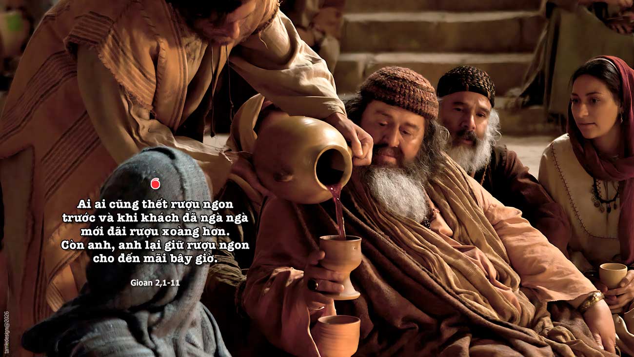 Hôm ấy, có tiệc cưới tại Ca-na miền Ga-li-lê. Trong tiệc cưới có thân mẫu Đức Giê-su. Đức Giê-su và các môn đệ cũng được mời tham dự. Khi thấy thiếu rượu, thân mẫu Đức Giê-su nói với Người: “Họ hết rượu rồi.” Đức Giê-su đáp: “Thưa bà, chuyện đó can gì đến bà và con? Giờ của con chưa đến.” Thân mẫu Người nói với gia nhân: “Người bảo gì, các anh cứ việc làm theo.” Ở đó có đặt sáu chum đá dùng vào việc thanh tẩy theo thói tục người Do-thái, mỗi chum chứa được khoảng tám mươi hoặc một trăm hai mươi lít nước. Đức Giê-su bảo họ: “Các anh đổ đầy nước vào chum đi!” Và họ đổ đầy tới miệng. Rồi Người nói với họ: “Bây giờ các anh múc và đem cho ông quản tiệc.” Họ liền đem cho ông. Khi người quản tiệc nếm thử nước đã hóa thành rượu (mà không biết rượu từ đâu ra, còn gia nhân đã múc nước thì biết), ông mới gọi tân lang lại và nói: “Ai ai cũng thết rượu ngon trước, và khi khách đã ngà ngà mới đãi rượu xoàng hơn. Còn anh, anh lại giữ rượu ngon cho đến mãi bây giờ.” Đức Giê-su đã làm dấu lạ đầu tiên này tại Ca-na miền Ga-li-lê và bày tỏ vinh quang của Người. Các môn đệ đã tin vào Người. Đó là lời Chúa.