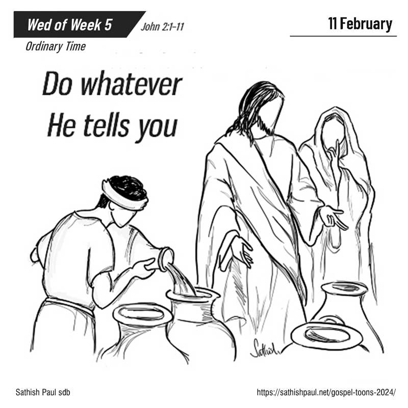 En ce temps-là, il y eut un mariage à Cana de Galilée. La mère de Jésus était là. Jésus aussi avait été invité au mariage avec ses disciples. Or, on manqua de vin. La mère de Jésus lui dit : « Ils n’ont pas de vin. » Jésus lui répond : « Femme, que me veux-tu ? Mon heure n’est pas encore venue. » Sa mère dit à ceux qui servaient : « Tout ce qu’il vous dira, faites-le. » (Jn 2, 1-11)