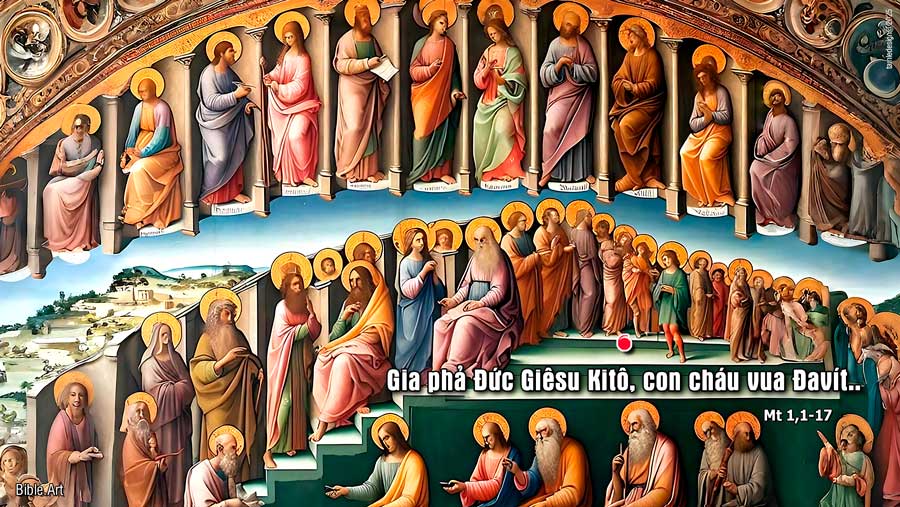 Đây là gia phả Đức Giê-su Ki-tô, con cháu vua Đa-vít, con cháu tổ phụ Áp-ra-ham: Ông Áp-ra-ham sinh ông I-xa-ác; ông I-xa-ác sinh ông Gia-cóp; ông Gia-cóp sinh ông Giu-đa và các anh em ông này; ông Giu-đa ăn ở với bà Ta-ma sinh ông Pe-rét và ông De-rác; ông Pe-rét sinh ông Khét-xơ-ron; ông Khét-xơ-ron sinh ông A-ram; ông A-ram sinh ông Am-mi-na-đáp; ông Am-mi-na-đáp sinh ông Nác-son; ông Nác-son sinh ông Xam-mon; ông Xam-mon lấy bà Ra-kháp sinh ông Bô-át; ông Bô-át lấy bà Rút sinh ông Ô-vết; ông Ô-vết sinh ông Gi-sai; ông Gi-sai sinh vua Đa-vít. Vua Đa-vít lấy vợ ông U-ri-gia sinh vua Sa-lô-môn; vua Sa-lô-môn sinh vua Rơ-khóp-am; vua Rơ-khóp-am sinh vua A-vi-gia; vua A-vi-gia sinh vua A-xa; vua A-xa sinh vua Giơ-ho-sa-phát; vua Giơ-ho-sa-phát sinh vua Gio-ram; vua Gio-ram sinh vua Út-di-gia; vua Út-di-gia sinh vua Gio-tham; vua Gio-tham sinh vua A-khát; vua A-khát sinh vua Khi-dơ-ki-gia; vua Khi-giơ-ki-gia sinh vua Mơ-na-se; vua Mơ-na-se sinh vua A-mon; vua A-mon sinh vua Giô-si-gia; vua Giô-si-gia sinh vua Giơ-khon-gia và các anh em vua này; kế đó là thời lưu đày ở Ba-by-lon. Sau thời lưu đày ở Ba-by-lon, vua Giơ-khon-gia sinh ông San-ti-ên; ông San-ti-ên sinh ông Dơ-rúp-ba-ven; ông Dơ-rúp-ba-ven sinh ông A-vi-hút; ông A-vi-hút sinh ông Ên-gia-kim; ông Ên-gia-kim sinh ông Át-dua; ông Át-dua sinh ông Xa-đốc; ông Xa-đốc sinh ông Gia-khin; ông Gia-khin sinh ông E-li-hút; ông E-li-hút sinh ông Ên-a-da; ông Ên-a-da sinh ông Mát-tan; ông Mát-tan sinh ông Gia-cóp; ông Gia-cóp sinh ông Giu-se, chồng của bà Ma-ri-a, bà là mẹ Đức Giê-su cũng gọi là Đấng Ki-tô. Như thế, tính chung lại thì: từ tổ phụ Áp-ra-ham đến vua Đa-vít, là mười bốn đời; từ vua Đa-vít đến thời lưu đày ở Ba-by-lon, là mười bốn đời; và từ thời lưu đày ở Ba-by-lon đến Đức Ki-tô, cũng là mười bốn đời. Đó là lời Chúa.