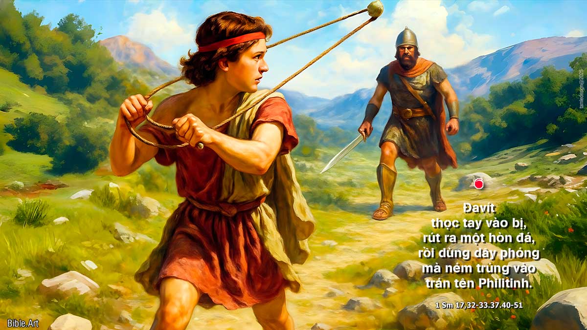 Ngày ấy, Đa-vít được dẫn đến gặp vua Sa-un và nói với vua Sa-un rằng: “Đừng ai ngã lòng vì tên Phi-li-tinh Go-li-át. Tôi tớ ngài đây sẽ đi chiến đấu với nó.” Vua Sa-un nói với Đa-vít: “Con không thể đến với tên Phi-li-tinh ấy để chiến đấu với nó, vì con chỉ là một đứa trẻ, còn nó, từ khi còn trẻ, đã là một chiến binh.” Đa-vít nói: “Đức Chúa là Đấng đã cứu con khỏi vuốt sư tử và vuốt gấu, chính Người sẽ cứu con khỏi tay tên Phi-li-tinh này.” Vua Sa-un nói với Đa-vít: “Thế thì con hãy đi, xin Đức Chúa ở với con!” Cậu cầm gậy trong tay, chọn lấy năm hòn đá cuội dưới suối, bỏ vào túi chăn chiên, vào bị của cậu, rồi tay cầm dây phóng đá, cậu tiến về phía tên Phi-li-tinh. Tên Phi-li-tinh từ từ tiến lại gần Đa-vít, đi trước mặt nó là người mang thuẫn.  Tên Phi-li-tinh nhìn, và khi thấy Đa-vít, nó khinh dể cậu, vì cậu còn trẻ, có mái tóc hung và đẹp trai.  Tên Phi-li-tinh nói với Đa-vít: “Tao là chó hay sao mà mầy cầm gậy đến với tao?” Và tên Phi-li-tinh lấy tên các thần của mình mà nguyền rủa Đa-vít. Tên Phi-li-tinh nói với Đa-vít: “Đến đây với tao, tao sẽ đem thịt mày làm mồi cho chim trời và dã thú.” Đa-vít bảo tên Phi-li-tinh: “Mày mang gươm, mang giáo, cầm lao mà đến với tao. Còn tao, tao đến với mày nhân danh Đức Chúa các đạo binh là Thiên Chúa các hàng ngũ Ít-ra-en mà mày thách thức. Ngay hôm nay Đức Chúa sẽ nộp mày vào tay tao, tao sẽ hạ mày và làm cho đầu mày lìa khỏi thân. Ngay hôm nay tao sẽ đem xác chết của quân đội Phi-li-tinh làm mồi cho chim trời và dã thú. Toàn cõi đất sẽ biết rằng có một Thiên Chúa che chở Ít-ra-en, và toàn thể đại hội này sẽ biết rằng không phải nhờ gươm, nhờ giáo mà Đức Chúa ban chiến thắng, vì chiến đấu là việc của Đức Chúa, và Người sẽ trao chúng mày vào tay chúng tao!” Khi tên Phi-li-tinh bắt đầu xông lên và đến gần để đương đầu với Đa-vít, thì từ trận tuyến Đa-vít vội vàng chạy ra đương đầu với tên Phi-li-tinh. Đa-vít thọc tay vào bị, rút từ đó ra một hòn đá, rồi dùng dây phóng mà ném trúng vào trán tên Phi-li-tinh. Hòn đá cắm sâu vào trán, khiến nó ngã sấp mặt xuống đất. Thế là Đa-vít thắng tên Phi-li-tinh nhờ dây phóng và hòn đá. Cậu hạ tên Phi-li-tinh và giết nó. Nhưng trong tay Đa-vít không có gươm. Đa-vít chạy lại, đứng trên xác tên Phi-li-tinh, lấy gươm của nó, rút khỏi bao, kết liễu đời nó và dùng gươm chặt đầu nó. Người Phi-li-tinh thấy người hùng của mình đã chết thì chạy trốn. Ðó là lời Chúa.