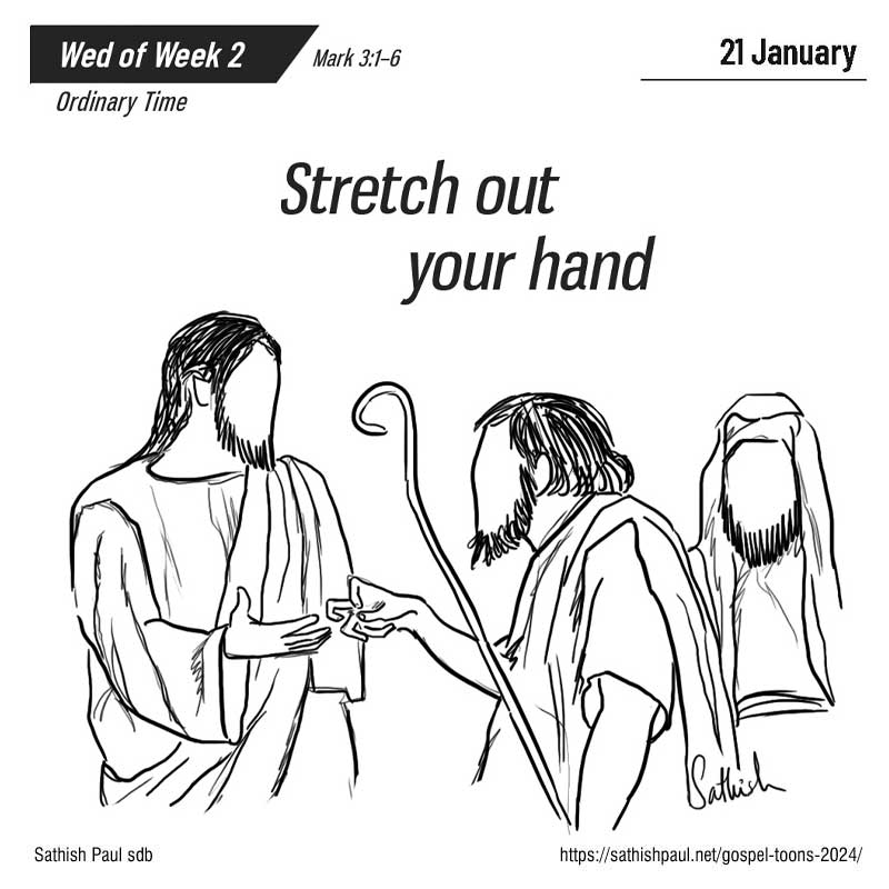 Et s’adressant aux autres : « Est-il permis, le jour du sabbat, de faire le bien ou de faire le mal ? de sauver une vie ou de tuer ? » Mais eux se taisaient. Alors, promenant sur eux un regard de colère, navré de l’endurcissement de leurs cœurs, il dit à l’homme : « Étends la main. » Il l’étendit, et sa main redevint normale. (Mc 3, 1-6)