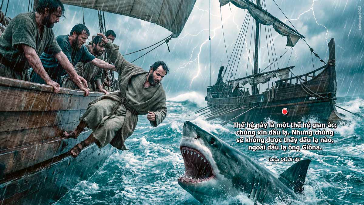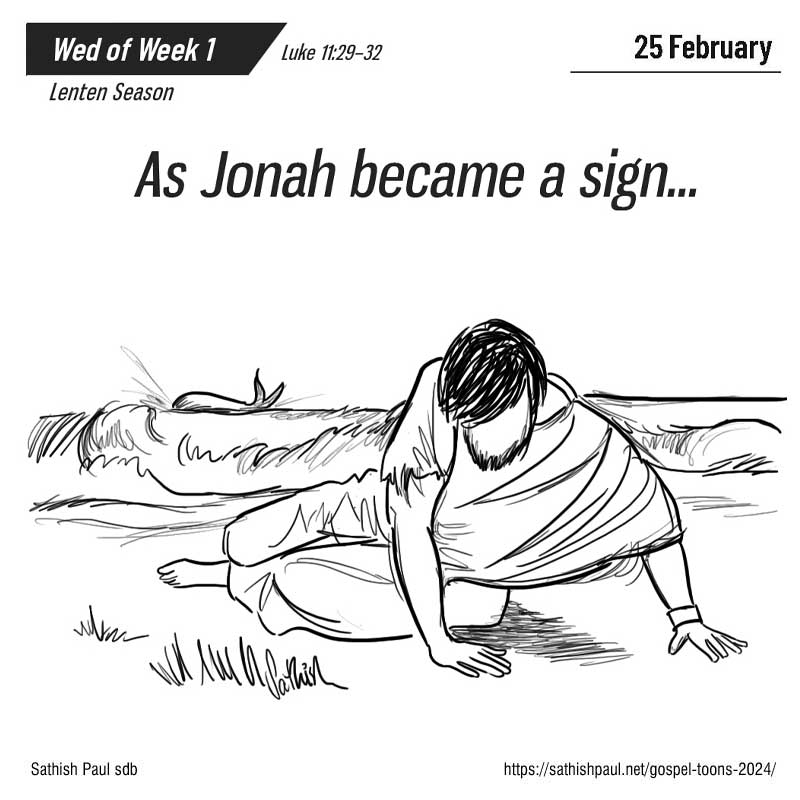 Hôm ấy, khi dân chúng tụ họp đông đảo, Đức Giê-su bắt đầu nói: “Thế hệ này là một thế hệ gian ác; chúng xin dấu lạ. Nhưng chúng sẽ không được thấy dấu lạ nào, ngoài dấu lạ ông Giô-na. Quả thật, ông Giô-na đã là một dấu lạ cho dân thành Ni-ni-vê thế nào, thì Con Người cũng sẽ là một dấu lạ cho thế hệ này như vậy. Trong cuộc Phán Xét, nữ hoàng phương Nam sẽ đứng lên cùng với những người của thế hệ này và bà sẽ kết án họ, vì xưa bà đã từ tận cùng trái đất đến nghe lời khôn ngoan của vua Sa-lô-môn; mà đây thì còn hơn vua Sa-lô-môn nữa. Trong cuộc Phán Xét, dân thành Ni-ni-vê sẽ chỗi dậy cùng với thế hệ này và sẽ kết án họ, vì xưa dân ấy đã sám hối khi nghe ông Giô-na rao giảng; mà đây thì còn hơn ông Giô-na nữa. Đó là lời Chúa.